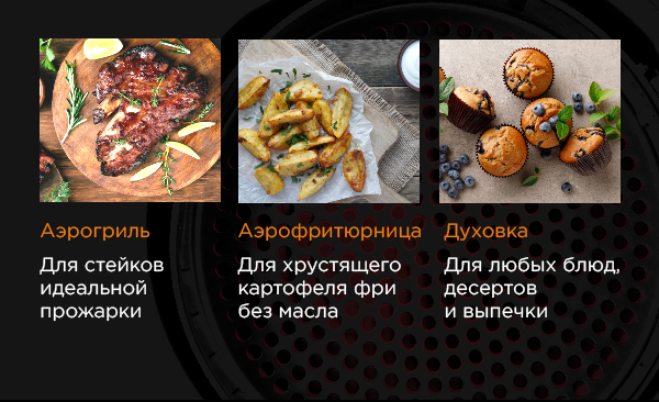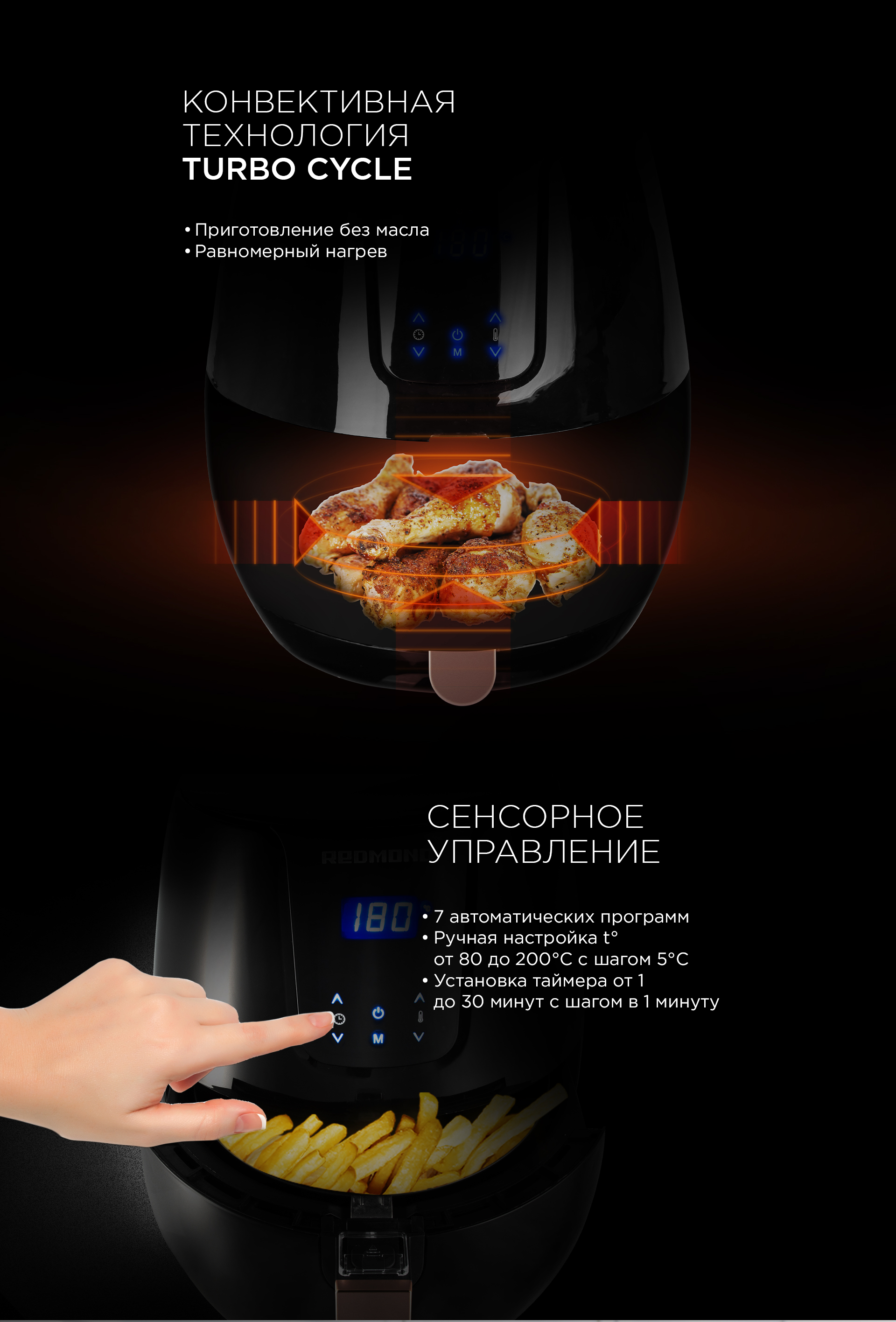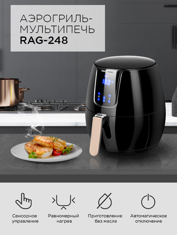 REDMOND RAG-248 – это современное многофункциональное устройство «3 в 1», в котором предусмотрены функции аэрогриля, аэрофритюрницы и духовки. С помощью RAG-248 можно жарить классические говяжьи стейки, куриные крылья и рыбные котлетки, делать наггетсы и картофель фри, готовить выпечку, десерты и многие другие блюда. При этом для приготовления привычных жареных и запеченных блюд вам не придется добавлять масло – еда в аэрогриле готовится без канцерогенов и лишних калорий!