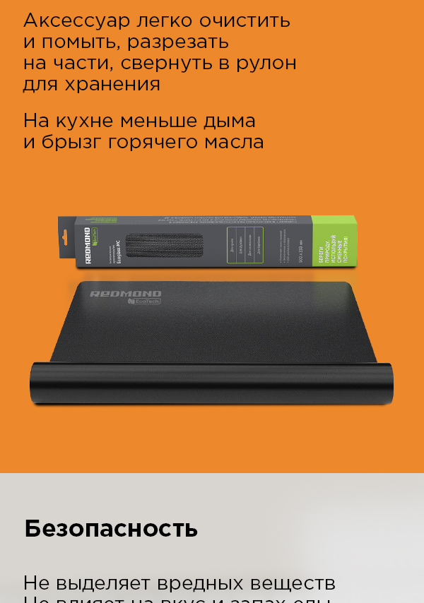Аксессуар не займет много места на кухне – просто сверните покрытие в рулон и храните в компактном виде в родной коробке или на полке. Упаковку можно удобно подвесить за специальный крючок.