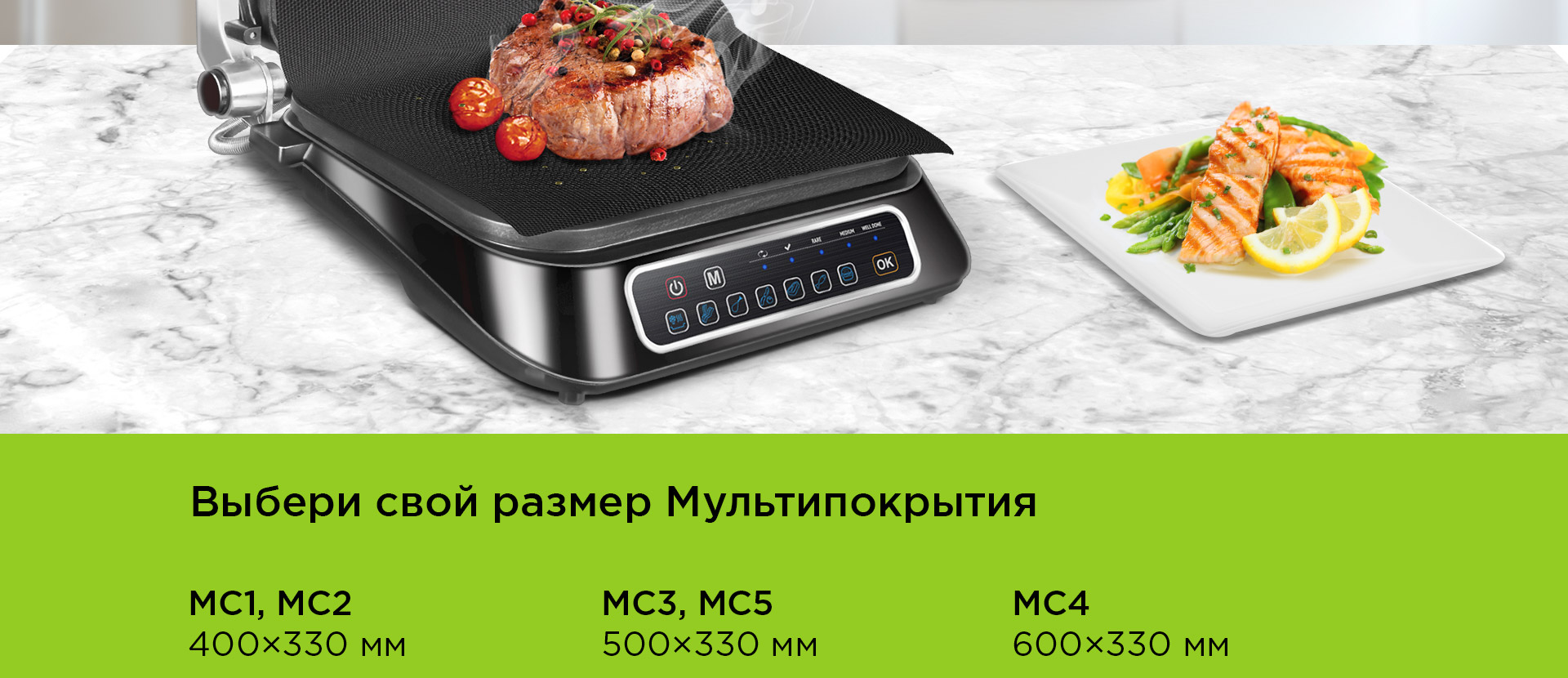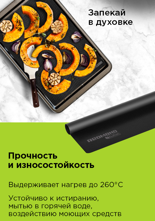 Жаростойкое Мультипокрытие выдерживает температуру до 260°C. Модель эффективно предотвращает пригорание и прилипание, не скользит, идеально подходит для домашней выпечки, раскатки теста, запекания мяса, рыбы, овощей и других блюд. Вы также можете использовать MC1 для заморозки продуктов, сушки грибов, ягод и фруктов.