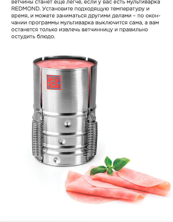 Сделайте ветчину из грудки индейки с каперсами или докторскую колбасу строго по ГОСТу! Блюда получатся с первого раза – с RHP-M02 достаточно подготовить ингредиенты, выложить их в пресс-форму и оставить вариться или запекаться. Во время варки или запекания продукты сдавливаются в специальном пакете* внутри пресс-формы: блюда приобретают идеальную структуру, сохраняют все натуральные соки и аромат продуктов, из которых изготовлены. Приготовление ветчины станет еще легче, если у вас есть мультиварка REDMOND. Установите подходящую температуру и время, и можете заниматься другими делами – по окончании программы мультиварка выключится сама, а вам останется только извлечь ветчинницу и правильно остудить блюдо.