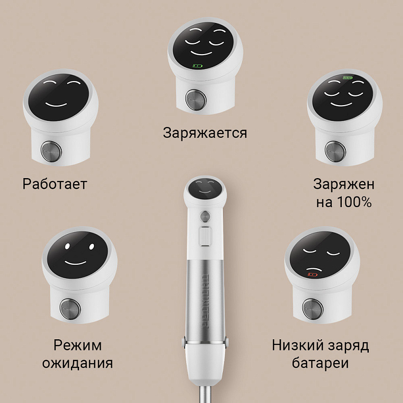 На анимированном дисплее наглядно отображается вся важная информацию о работе устройства. Индикатор в виде смайла помогает быстро определить текущее состояние блендера — использовать его удобно: