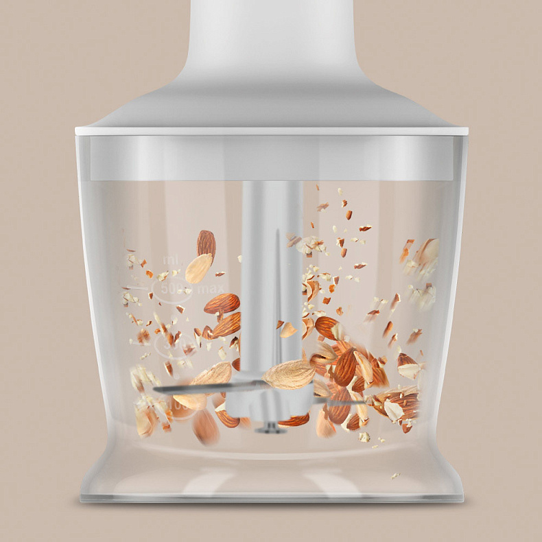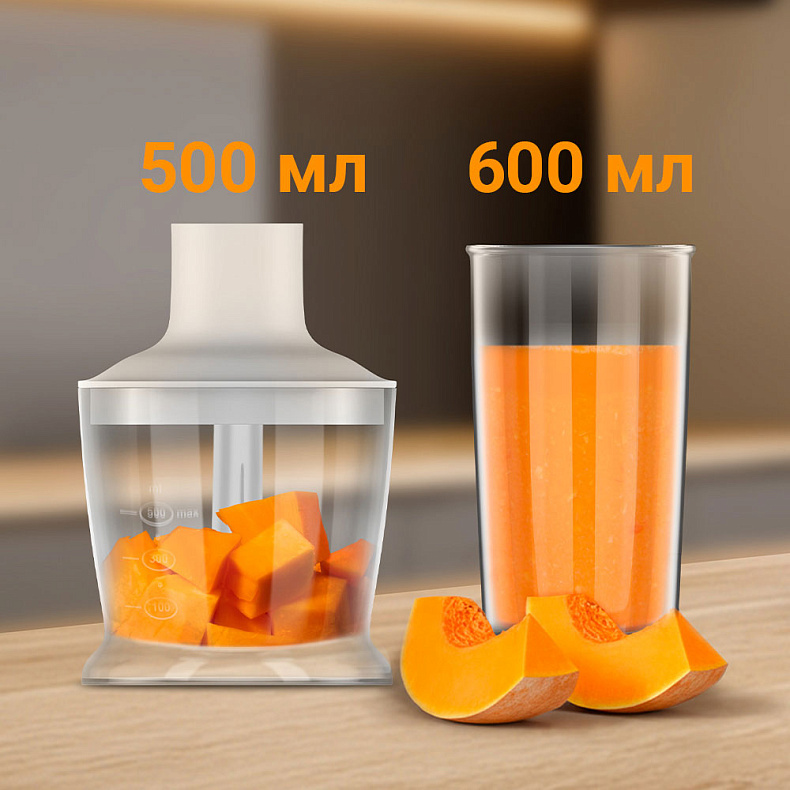В комплекте вы найдете удобный стакан для смешивания объемом 600 мл — он подходит для приготовления смузи, фрешей, соусов и пюре. Измельчитель с чашей на 500 мл позволяет быстро обработать овощи, зелень, сыр или орехи для салатов, зажарки или начинки.