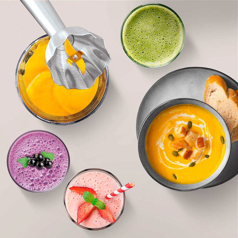 Уникальная конструкция ножа позволяет достичь однородной консистенции при смешивании и блендировании. Супы-пюре, нежные муссы или фруктовые пюре получатся без комочков и лишних усилий.