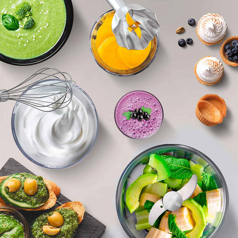 Прибор один — возможностей много. С помощью BH424 вы приготовите свежие соусы, паштеты, густой крем для десертов и измельчите специи или орехи. Он заменит три устройства на кухне: блендер, миксер, измельчитель.
