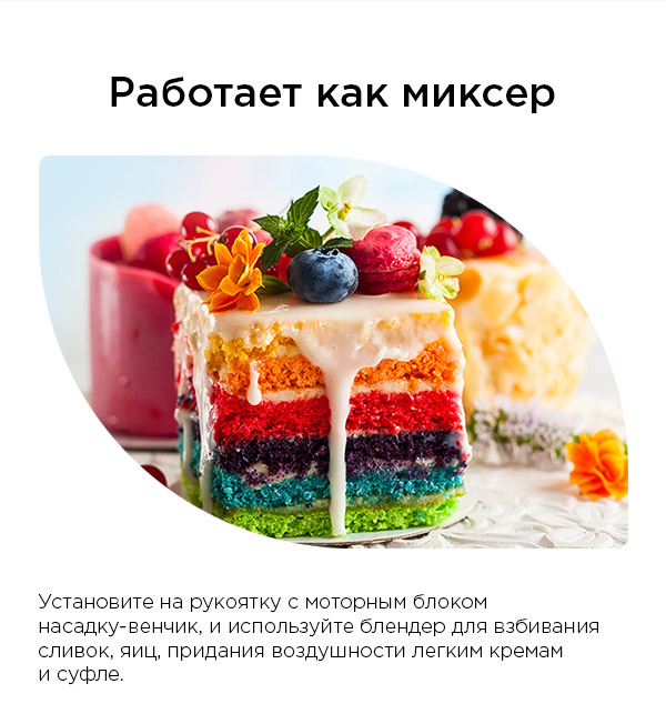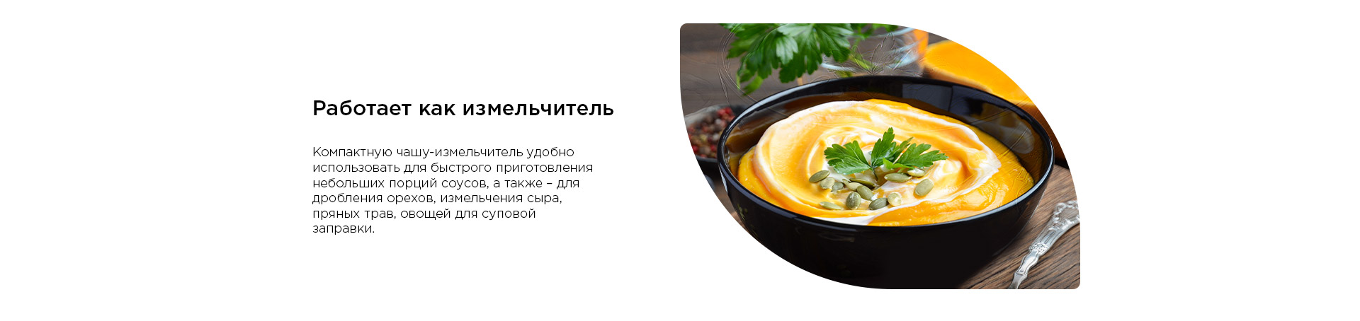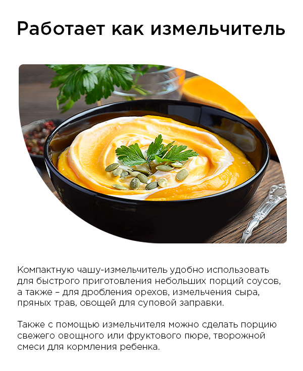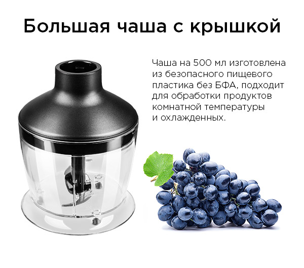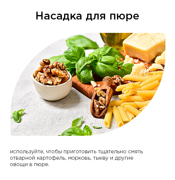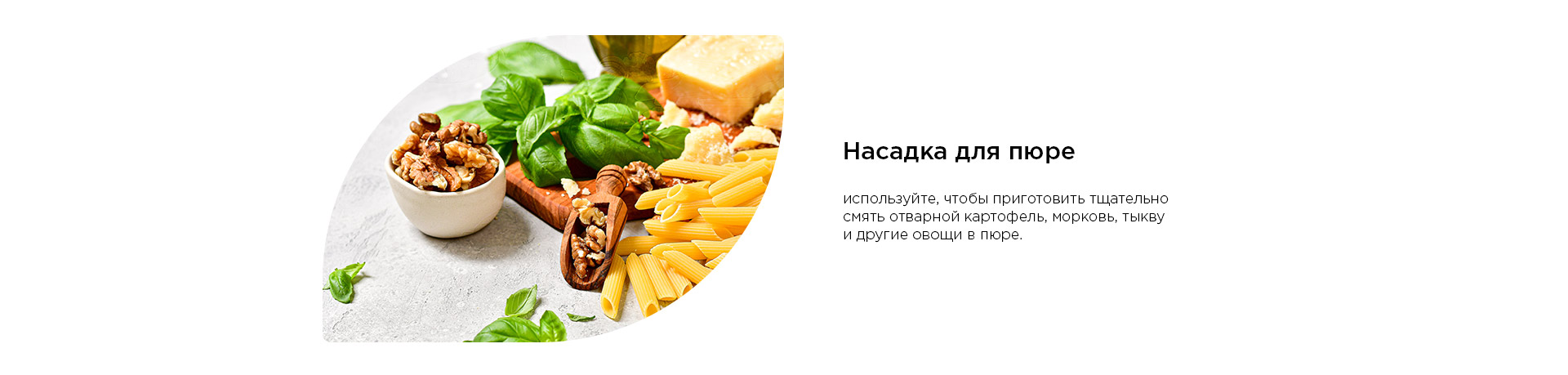 Рабочие части насадок и S-образный нож изготовлены из нержавеющей стали – прочного, надежного, устойчивого к перепадам температуры и механическим повреждениям материала. Благодаря этому вы можете обрабатывать горячие продукты и жидкости, не бояться, что при случайном падении насадки расколются. Насадка для пюре и ее нож – пластиковые. Нож насадки не взбивает, а равномерно перетирает овощи в нежное пюре.