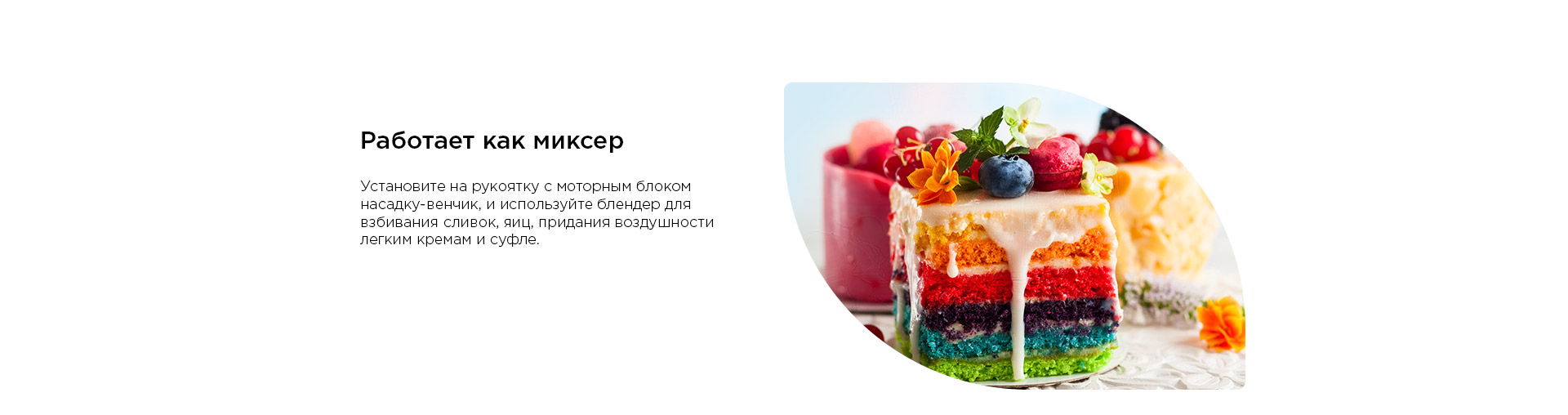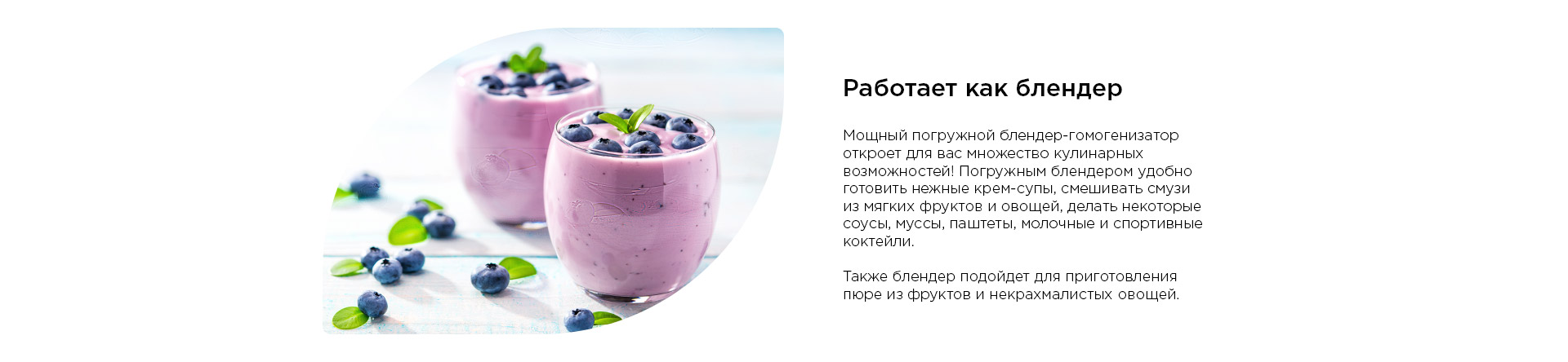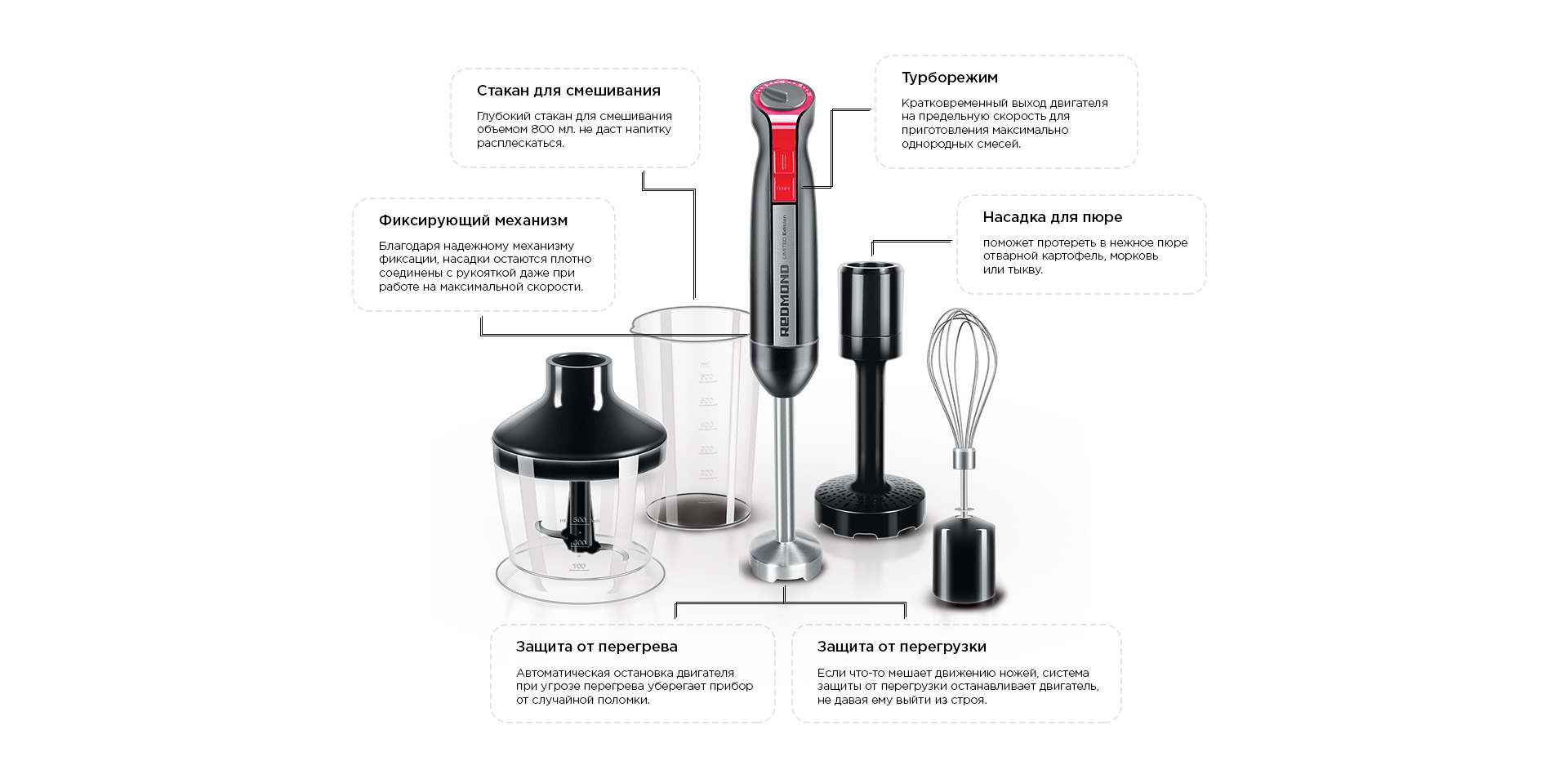 Погружной блендер REDMOND RНВ-2971 – многофункциональный прибор «4 в 1» для быстрого взбивания, перемалывания, смешивания и пюрирования продуктов. Модель имеет отличительную особенность – помимо стандартных ножа для измельчения, венчика и блендера в комплект входит специальная насадка для приготовления воздушного пюре без единого комочка.