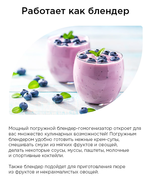 Двигатель блендера надежно защищен от случайных поломок при перегреве и перегрузке. При угрозе перегрева, если вы случайно превысите рекомендованное время, прибор автоматически останавливается. При этом он не выходит из строя: вы можете пользоваться блендером сразу, как только он остынет.
