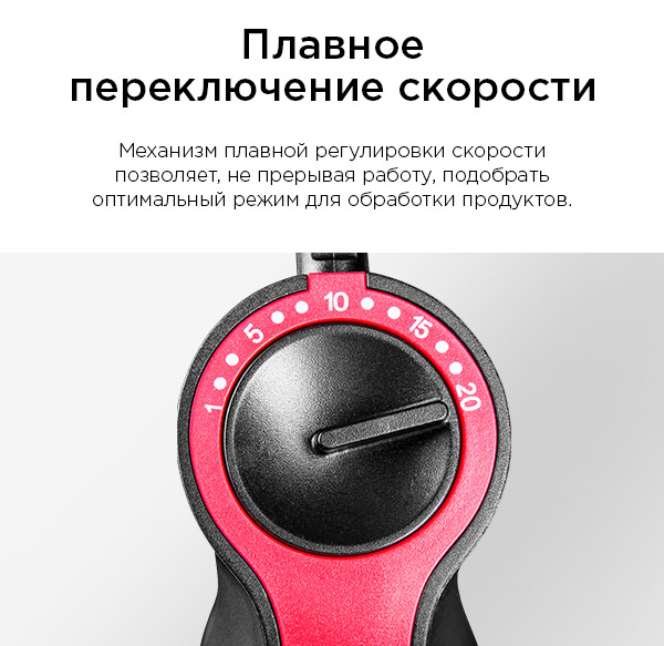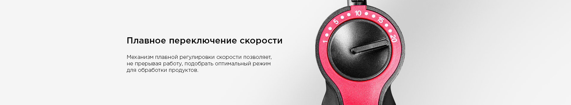 Модель 2971 оснащена двумя скоростными режимами: основным и «Турбо». Точно настраивайте скорость вращения ножей, чтобы избежать разбрызгивания, тщательно измельчить или смешать продукты. К примеру, чтобы приготовить суп-пюре, начните измельчать отварные овощи в основном режиме на минимальной скорости 9700 об/мин и постепенно увеличивайте скорость до максимальной в этом режиме 12400 об/мин. На последнем этапе приготовления, используйте режим «Турбо»: быстрое вращение насадок со скоростью 14600 об/мин поможет избавиться от мельчайших комочков.