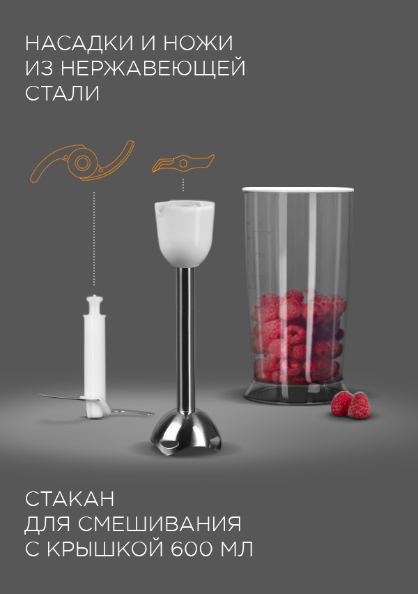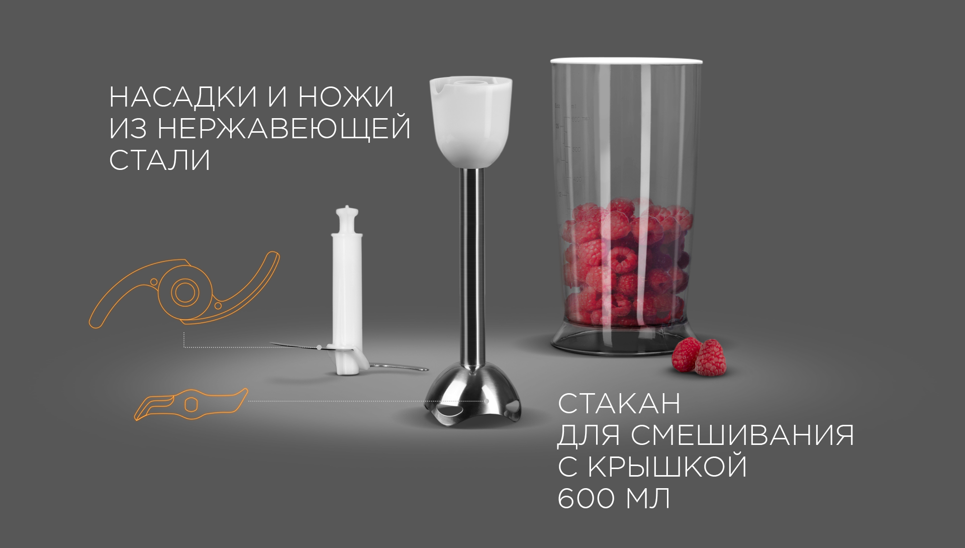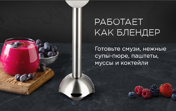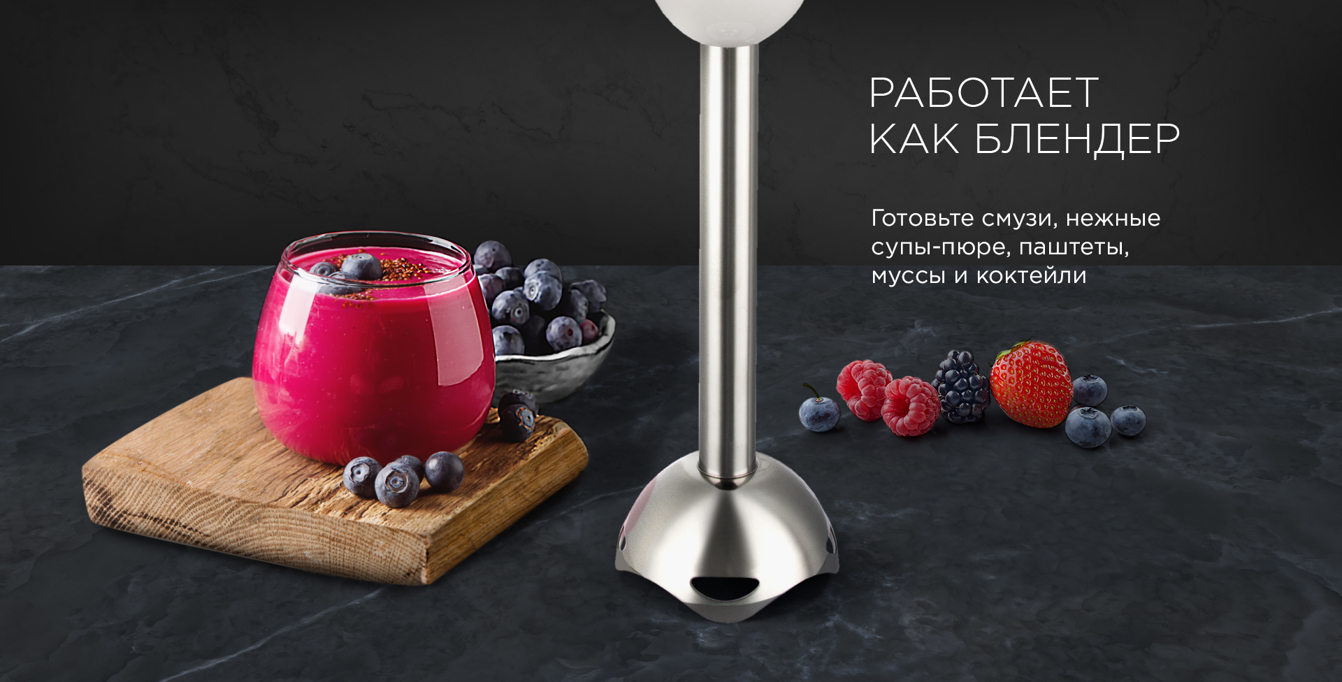 • Насадка-блендер из нержавеющей стали измельчает и перемешивает компоненты для супов-пюре, соусов, молочных коктейлей, ягодных смузи и детского питания.