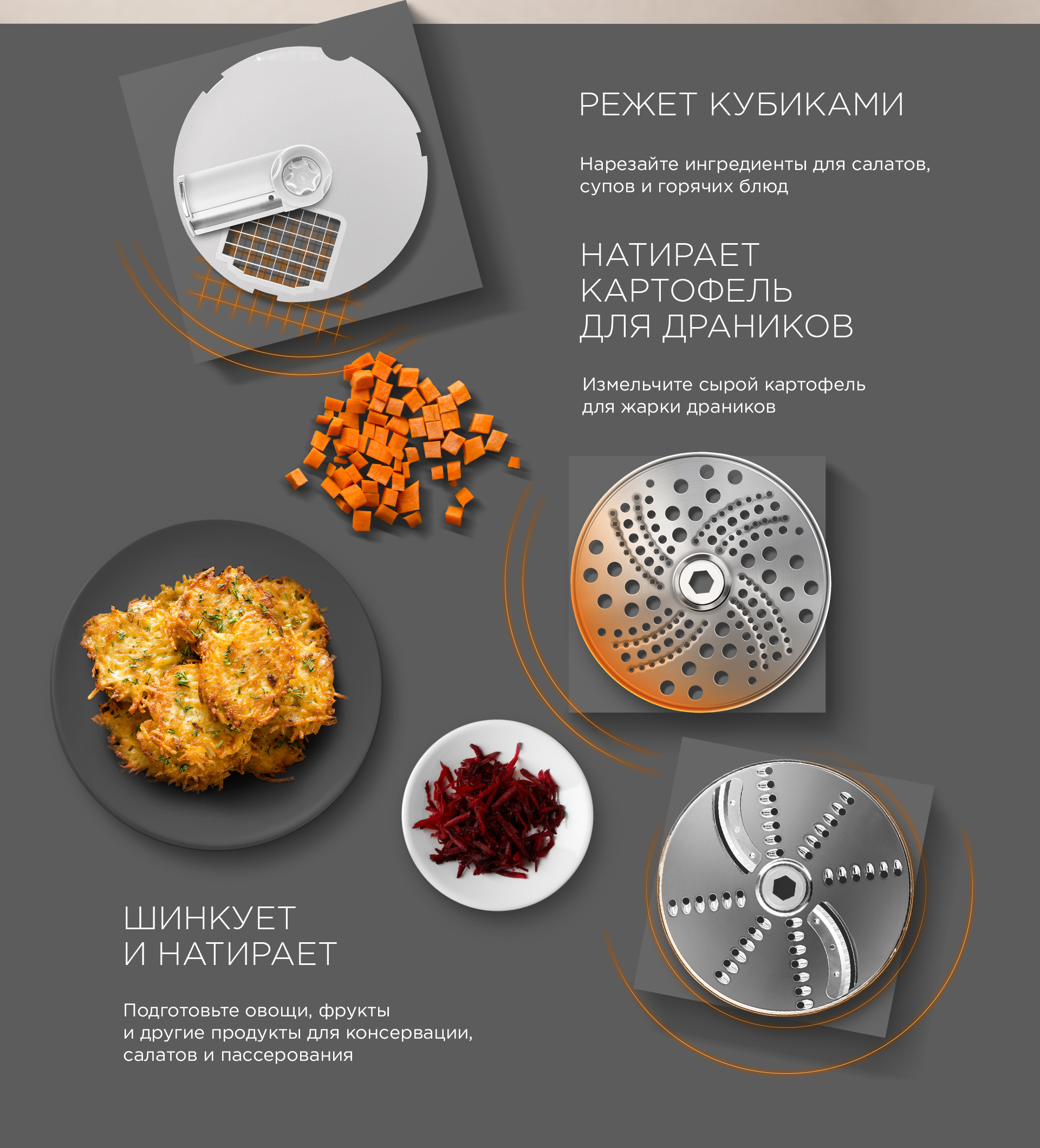 • Насадка для драников готовит картофельное тесто без лишнего крахмала и влаги.