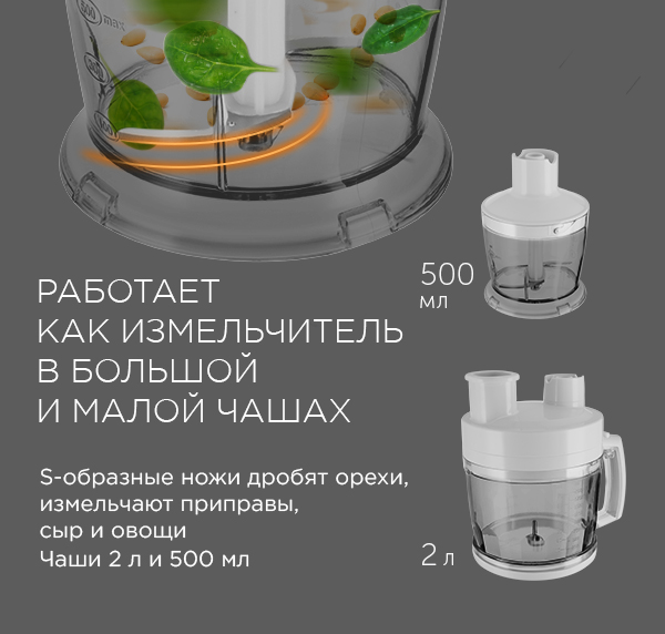 • Для удобного измельчения разного объема продуктов предусмотрены большая (2 л) и малая (500 мл) чаши. В каждой из них есть S-образный нож из нержавеющей стали, который качественно режет мясо, овощи, орехи, зелень и другие ингредиенты.