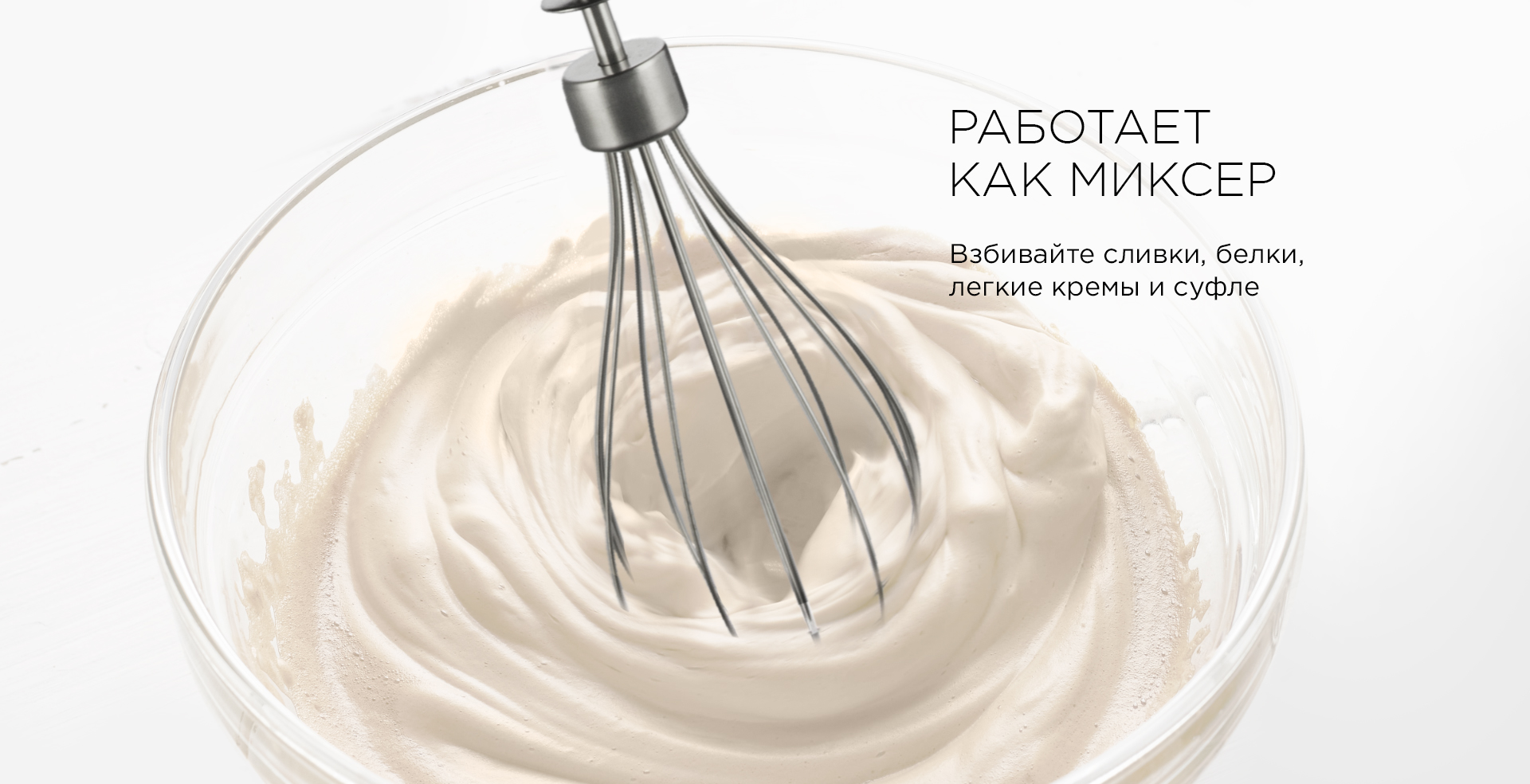 • Насадка-венчик взбивает яйца и сливки для пышных кремов, муссов и суфле. В комплект входит стакан с крышкой (600 мл), в котором можно аккуратно смешивать и взбивать жидкие ингредиенты блендером и венчиком.