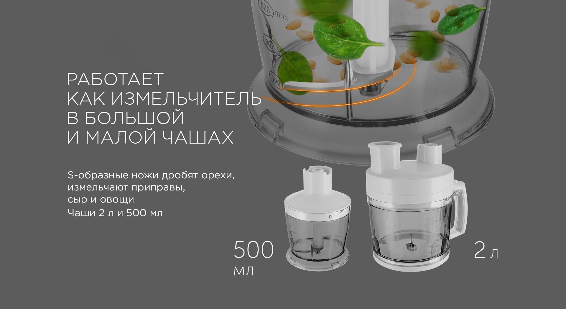 • Блендер оснащен набором насадок, благодаря которым его возможности столь же широки, как у кухонного комбайна: