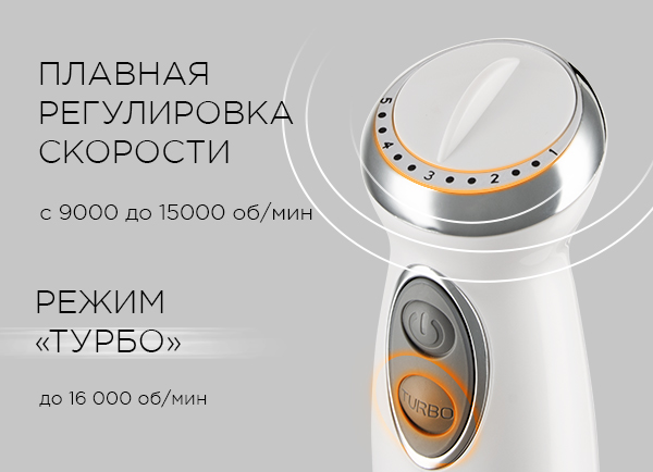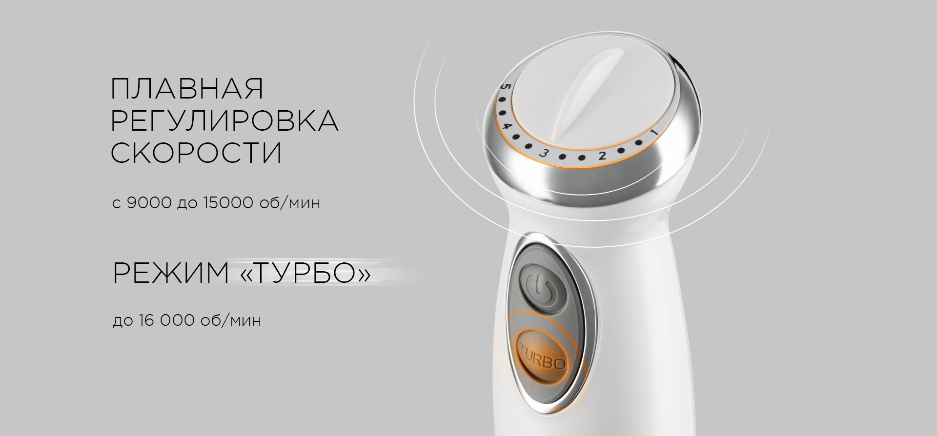 Скорость работы блендера в обычном режиме — 9000-15000 об/мин. Плавно увеличивайте ее, чтобы тщательно взбить белки или измельчить сваренные овощи. Добиться идеального результата поможет режим «Турбо», при котором скорость вращения насадок достигает 16 000 об/мин. Вы получите пюре без единого комочка и густую белковую пену с устойчивыми пиками. Для удобного переключения скоростей на ручке прибора расположен регулятор.