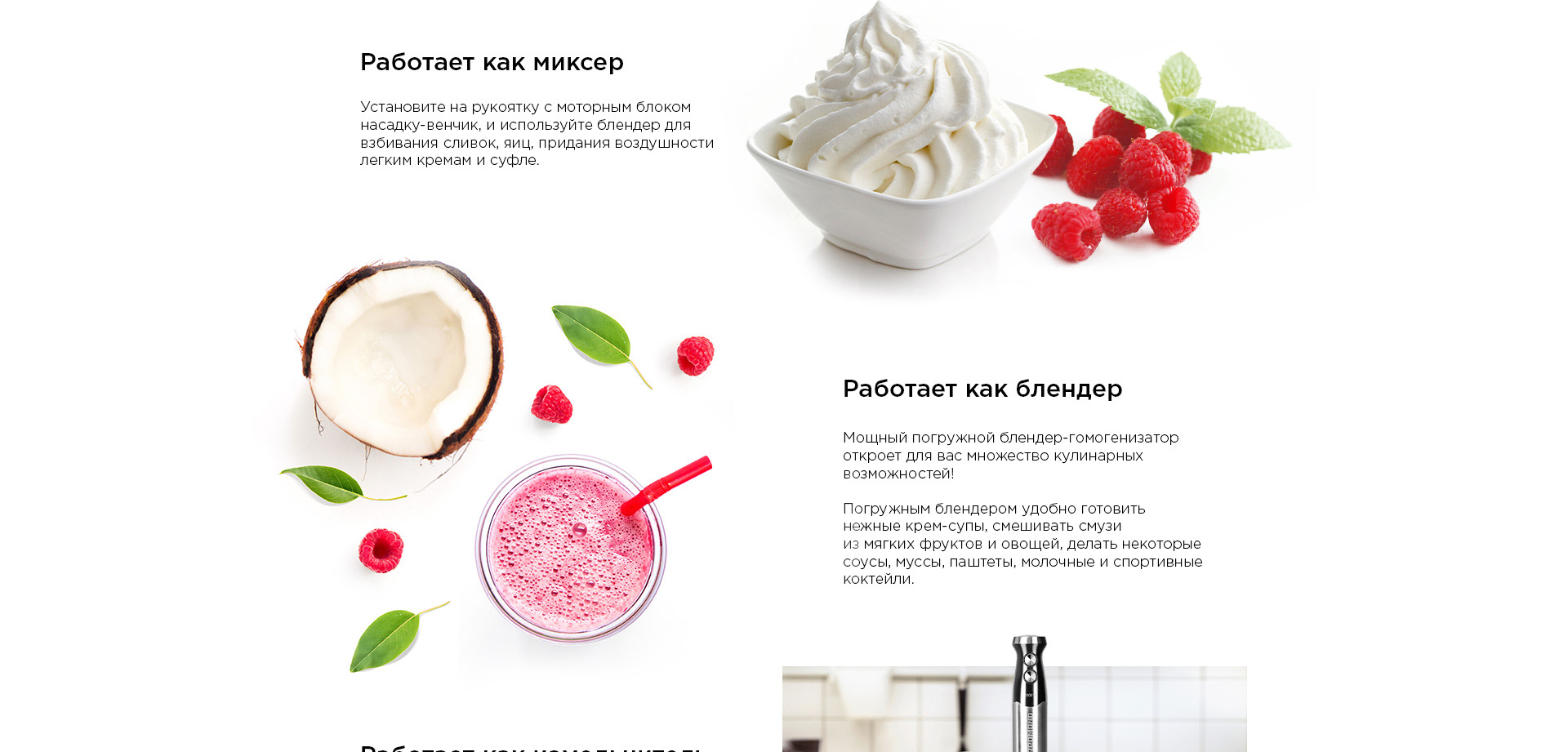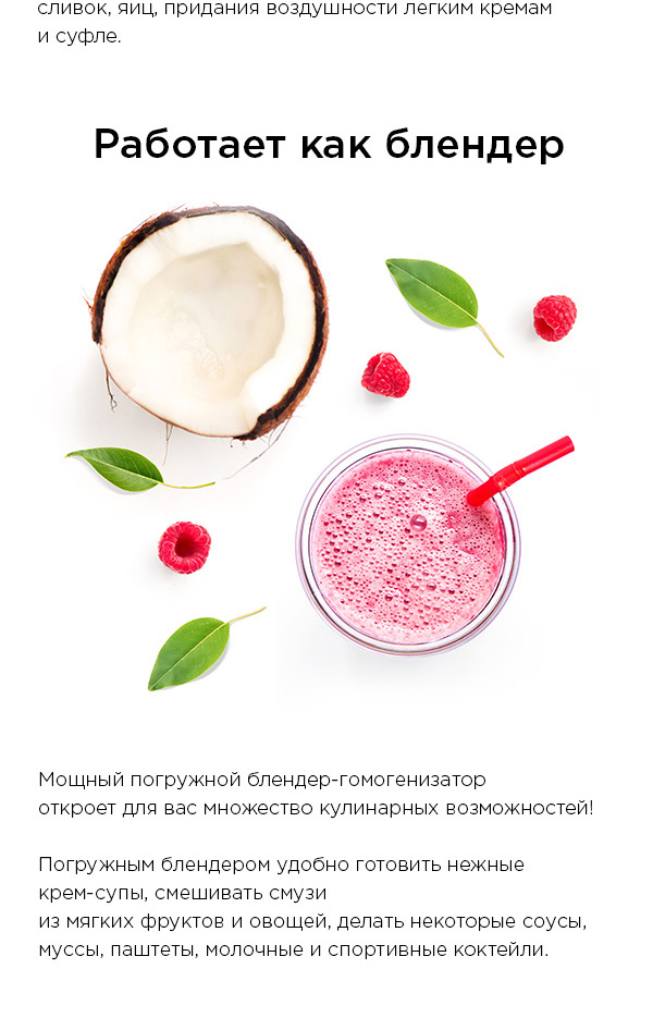 Насадка-блендер позволит с легкостью смешать ингредиенты для питательного грибного крем-супа, освежающего гаспачо, домашнего майонеза или томатного соуса для лазаньи. Также используйте погружной блендер, чтобы сделать витаминный ягодный смузи, полезный протеиновый или фруктово-овощной коктейль.