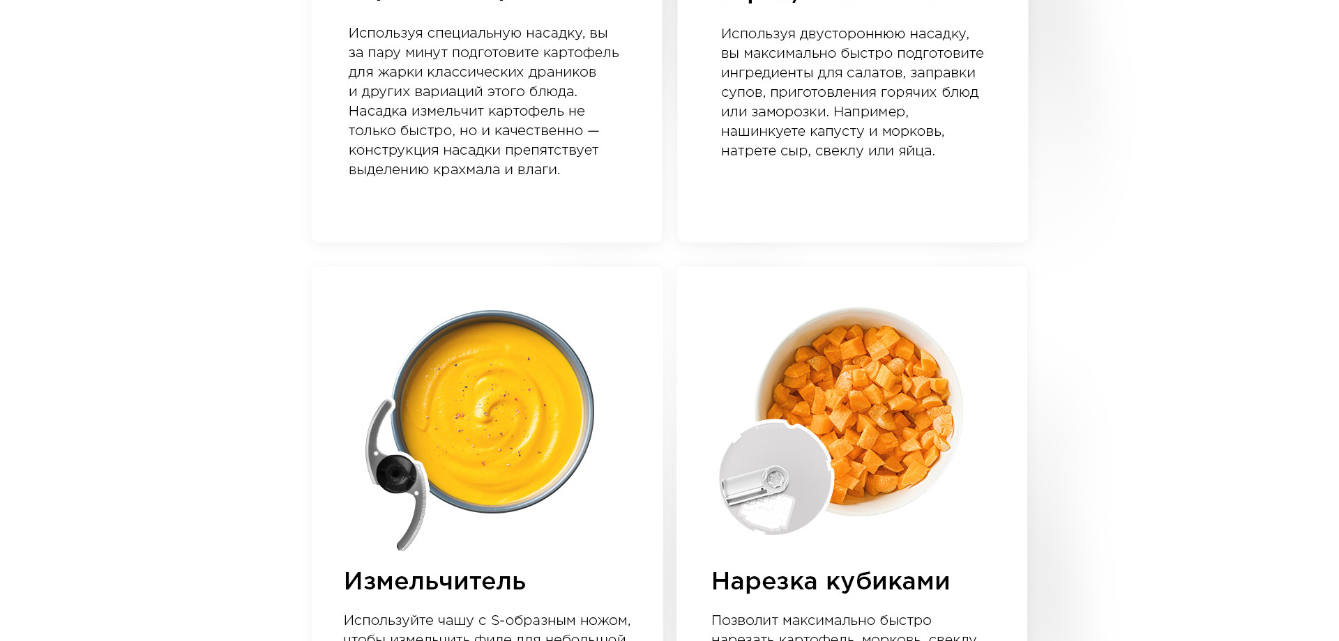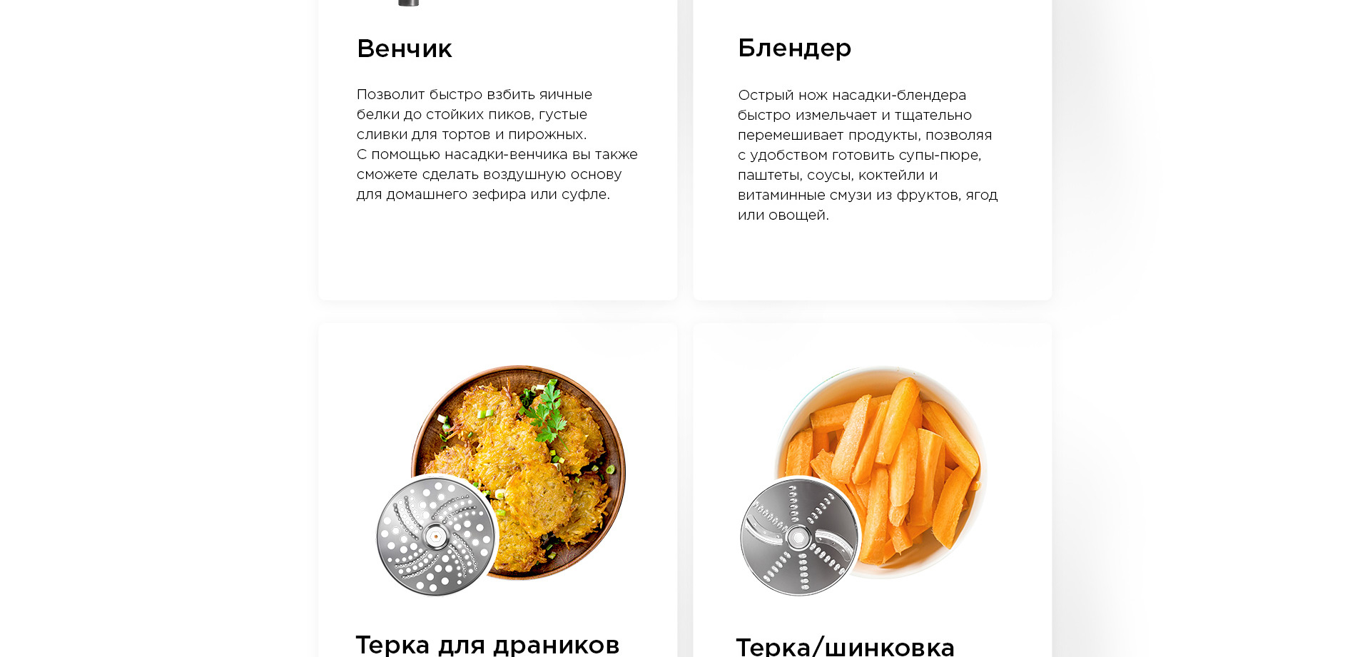 Насадка-терка позволяет за несколько секунд натереть сыр для пиццы и пасты, а также подготовить ингредиенты для свекольного или морковного салата. Используйте шинковку, чтобы нарезать яблоки, огурцы и капусту для салатов или морковь и лук – для последующей обжарки.