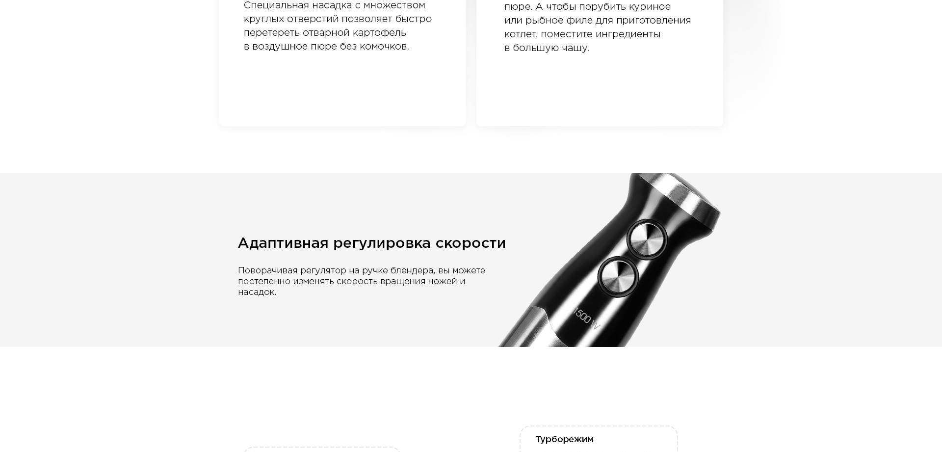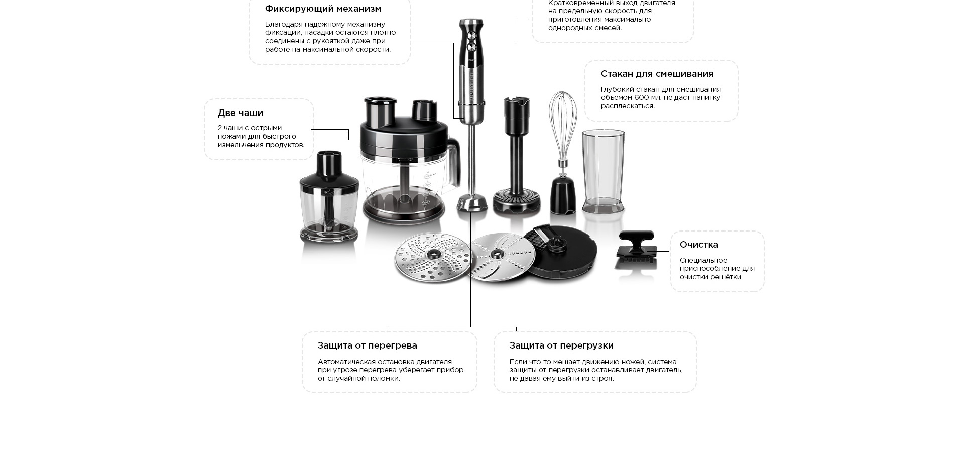 Поворачивая регулятор на ручке блендера, вы можете постепенно изменять скорость вращения ножей и насадок в диапазоне 10 200-13 500 об/мин. Таким образом вы легко подберете оптимальный режим и для измельчения твердых продуктов, и для смешивания мягких ингредиентов.