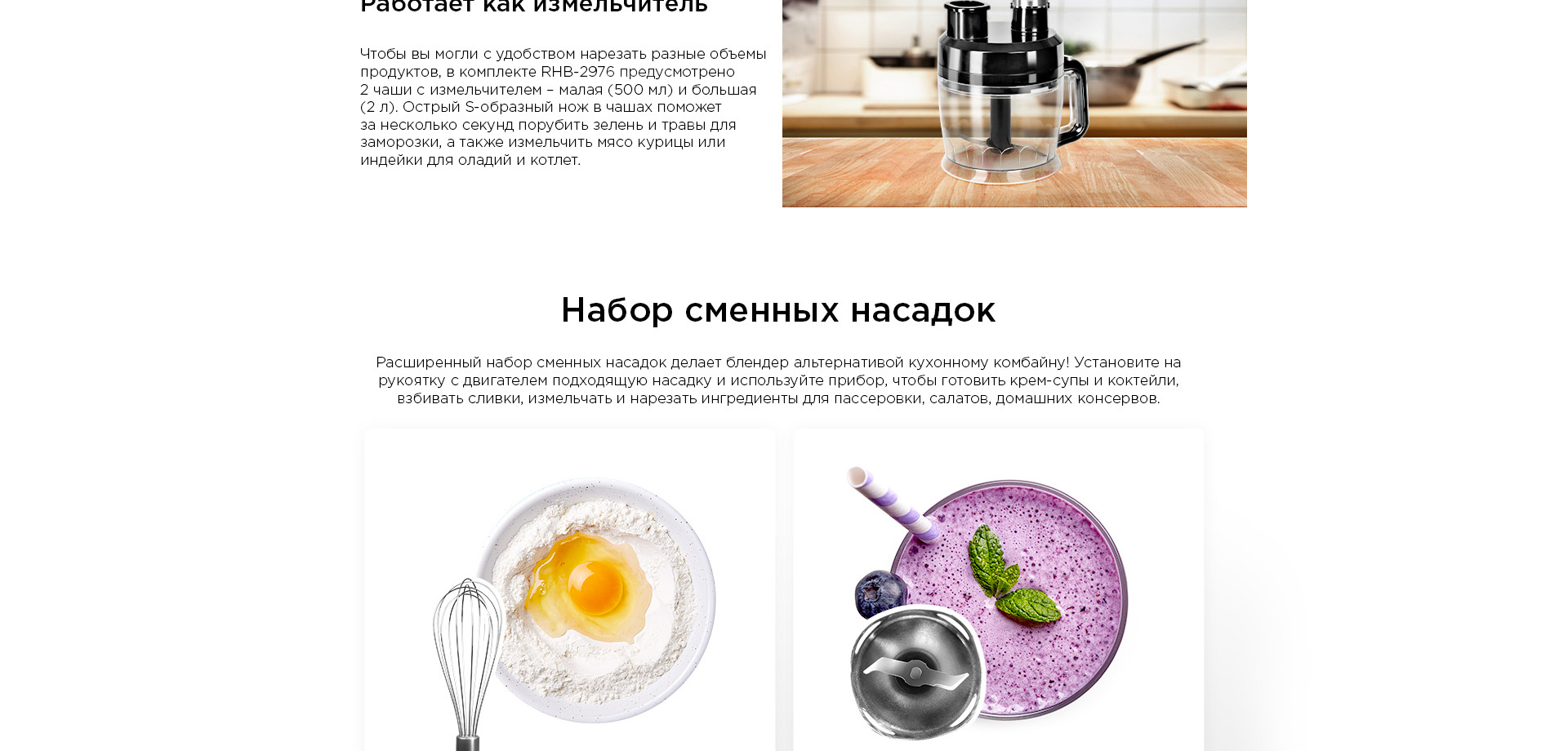 В комплекте RHB-2976 идут 2 чаши с острыми ножами для быстрого измельчения продуктов. Сделать ореховую или шоколадную крошку для посыпки мороженого и пирожных будет удобнее в малой чаше объемом 500 мл, чтобы порубить куриное или рыбное филе для приготовления котлет, поместите ингредиенты в большую чашу (2 л).