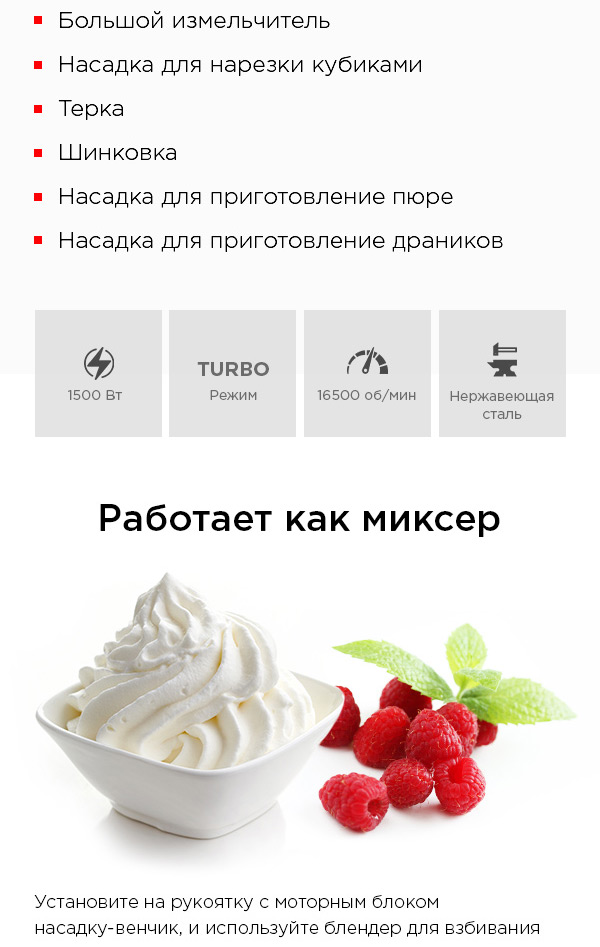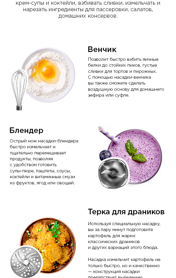 Идеальная находка для тех кто любит готовить, он разнообразит ваши блюда на максимум по этом облегчит вам этапы приготовления ,полноценный комбайн , есть терки и шинковка ,даже Насадка для резки кубиками что можно быстро сделать любой салат либо окрошку ,измельчитель и венчик ,ну и Насадка для пюре ,толчонка получается воздушная без комочков и не нужно напрягаться достаточно просто нажать на кнопку !