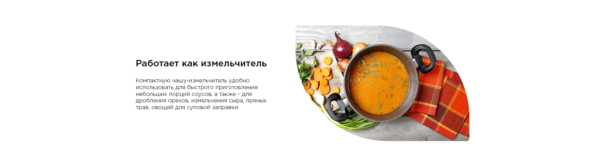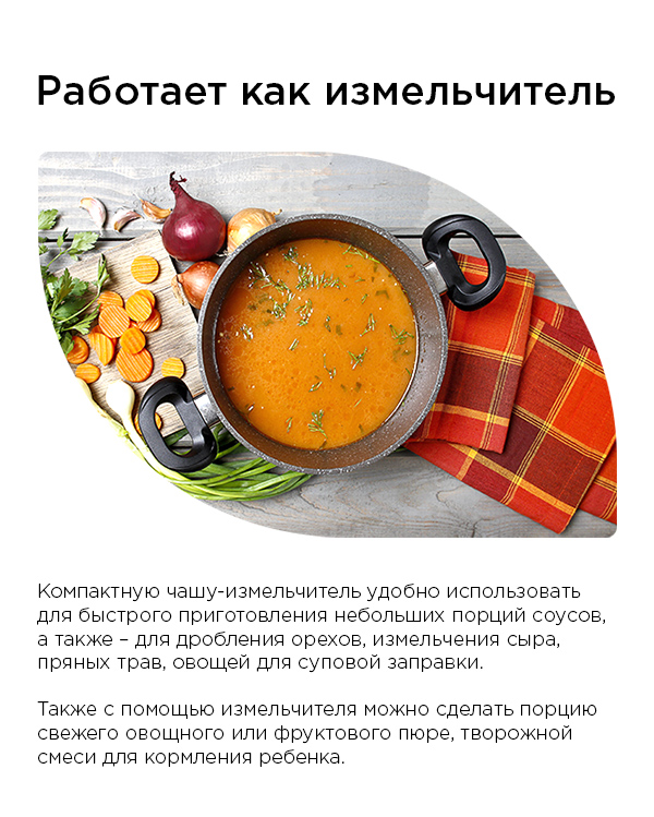 Чтобы перемолоть в крошку орехи или сделать смесь из приправ для горячего, установите на корпус маленький контейнер-измельчитель. Выбирайте любимые сочетания пряностей и готовьте смеси небольшими порциями – так их аромат будет максимально ярким и прекрасно оттенит вкус ваших блюд.
