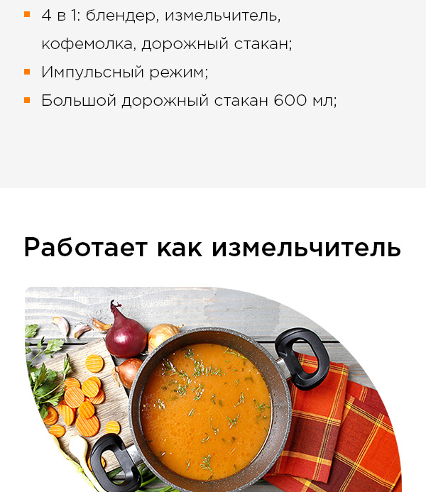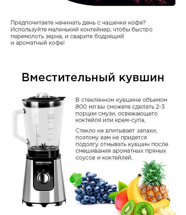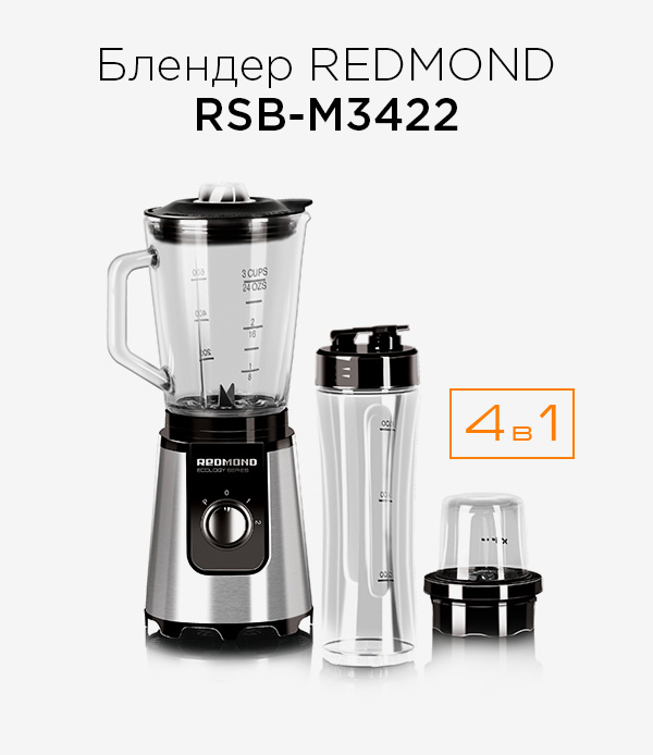 С помощью мультифункционального блендера «4 в 1» REDMOND RSВ-M3422 вы быстро и легко подготовите ингредиенты для спортивного питания, полезных напитков и диетических блюд! RSB-M3422 – это стационарный блендер, мини-измельчитель, кофемолка и прочный дорожный стакан, в котором можно смешивать смузи и коктейли.