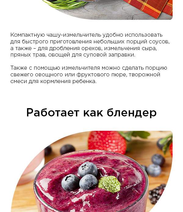 Больше не нужно тратить время и вручную молоть специи с помощью мельницы или ступки. Установите специальную насадку и поверните регулятор – RSB-M3422 быстро и тщательно измельчит травы, крупную соль, перец горошком и другие пряности.