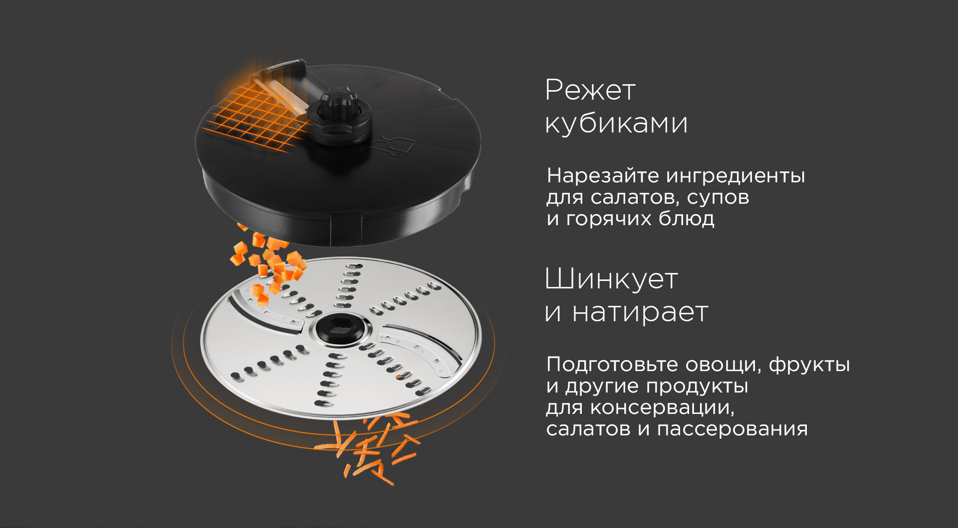 Мотор с максимальной мощностью 1500 Вт обеспечивает эффективную обработку продуктов любой плотности. Вы легко взобьете белки до стойких пиков, измельчите твердые орехи и сыры.
