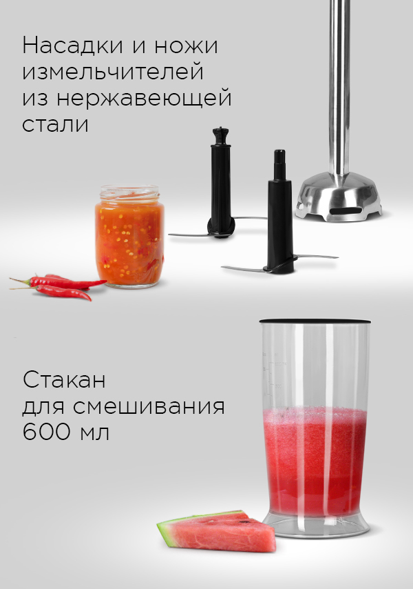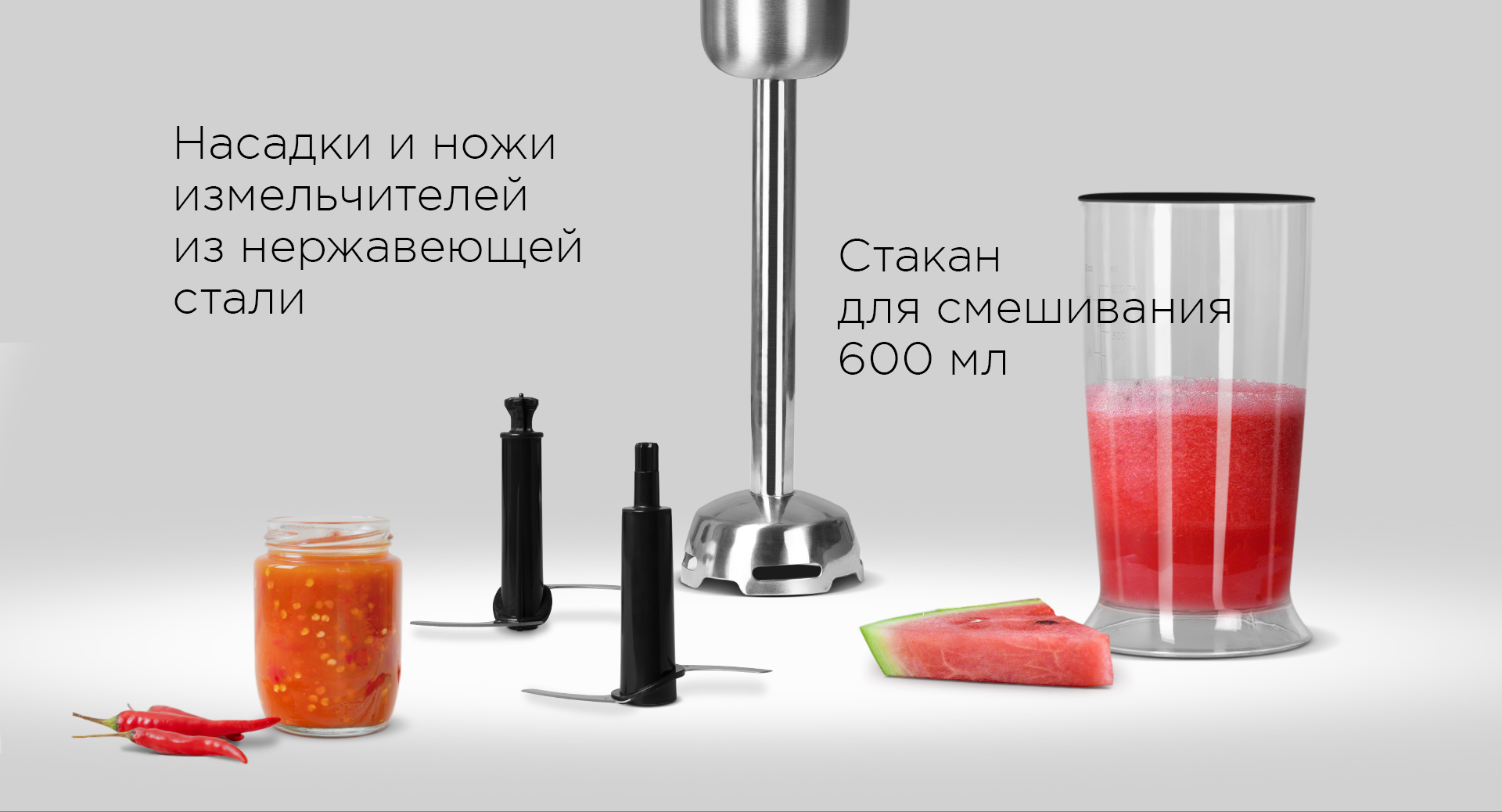 В комплектацию RHB-CB2988 входит специальный стакан (600 мл) – используйте его при смешивании напитков и приготовлении соусов. Высокие стенки емкости предотвратят разбрызгивание смесей.