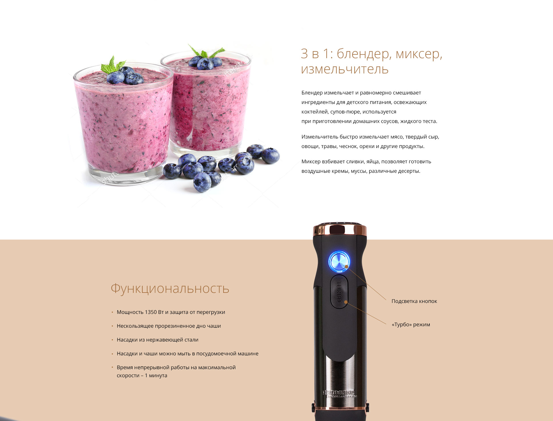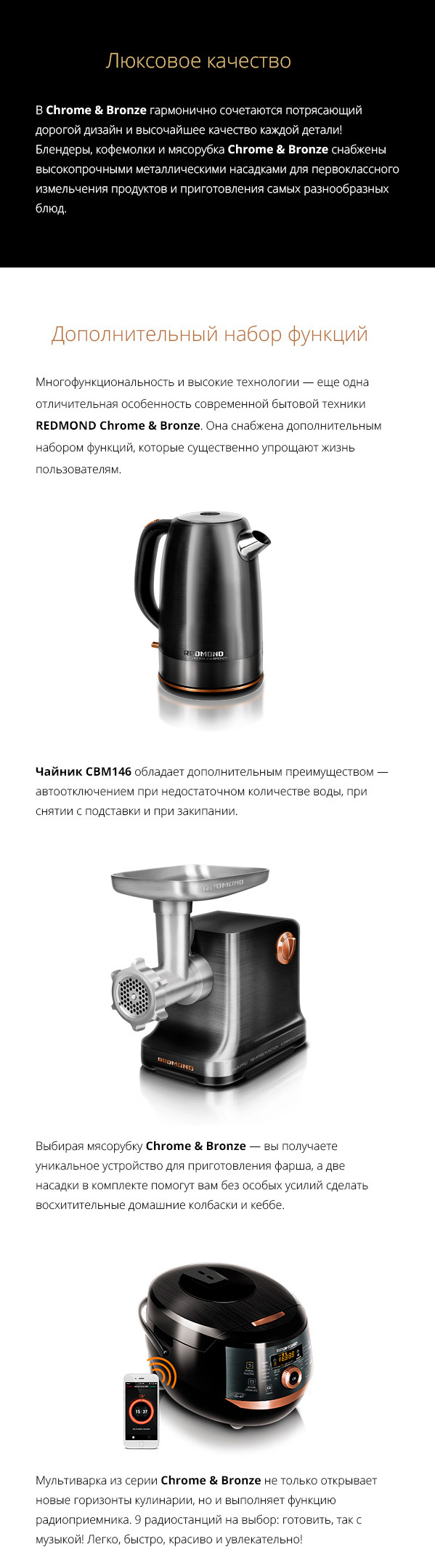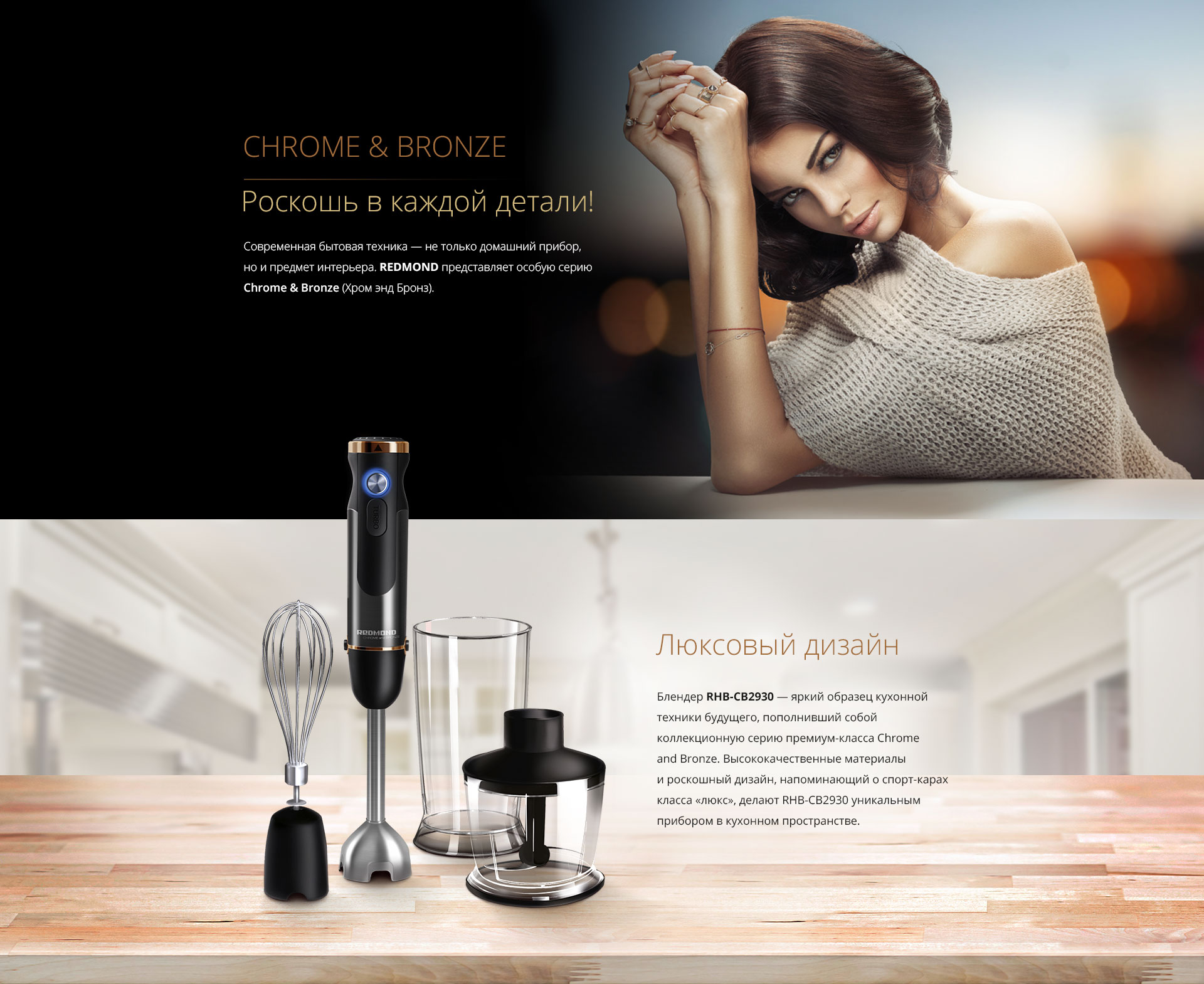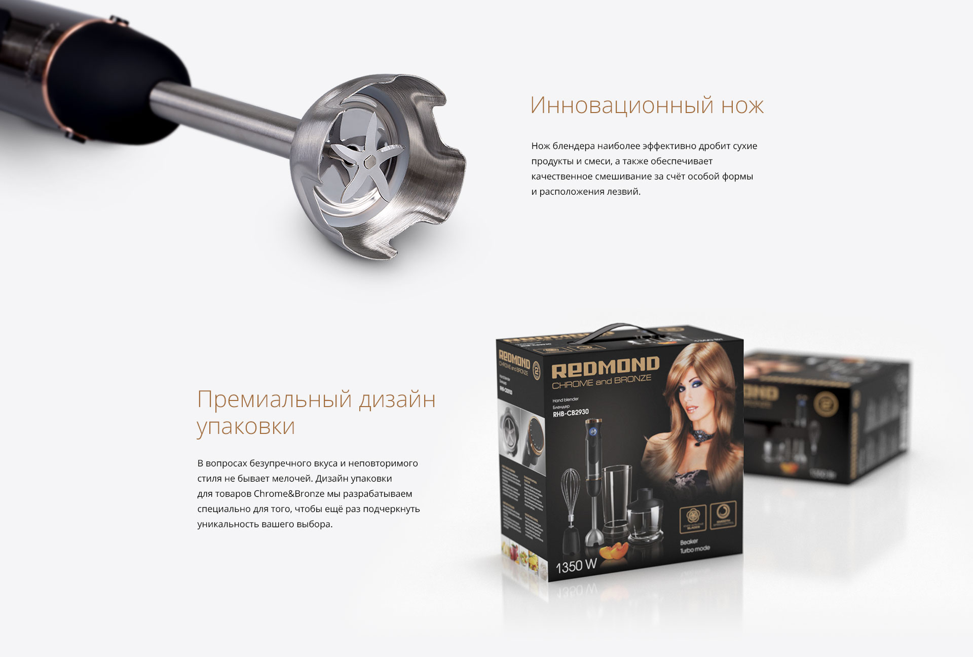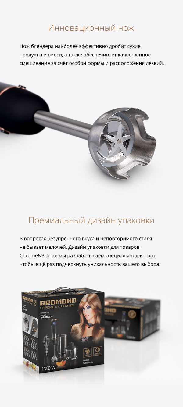 Блендер REDMOND RHB-CB2930 – многофункциональный кухонный прибор «3 в 1», который легко и быстро измельчает, взбивает, смешивает любые продукты. RHB-CB2930 входит в серию Chrome&Bronze, воплощающую в себе фантастическую технологичность и абсолютно уникальный дизайн. .