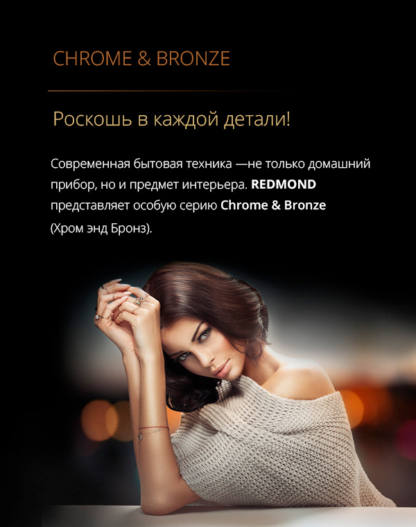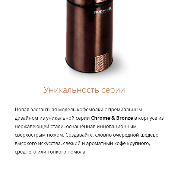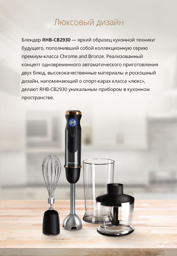 Блендер RHB-CB2930 выполнен в элегантном стильном дизайне: регулятор скорости и кольцо фиксатора имеют премиальный бронзовый цвет, а металлическая декоративная накладка – актуальный черный хром.