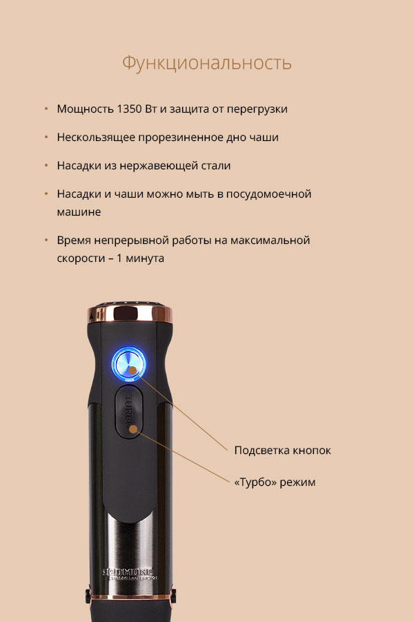 Насадка-блендер оснащена 5-лепестковым ножом из высококачественной легированной стали, который позволит вам быстро и качественно перерабатывать продукты для приготовления сливочных крем-супов, соусов, нежных паштетов, а также для натурального детского питания из отварных овощей и мягких фруктов.