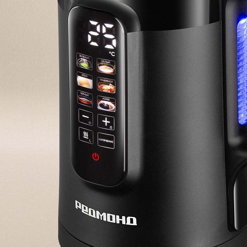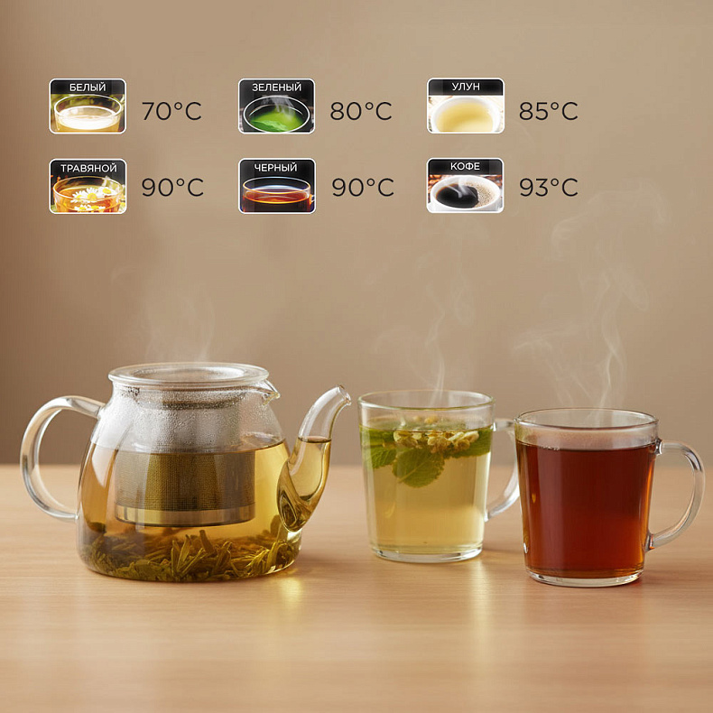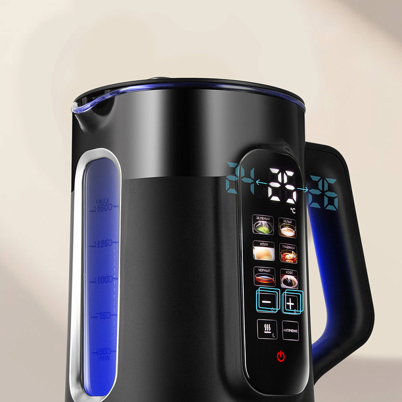 Чайник позволяет точно выбирать температуру воды с шагом в 1 °C в диапазоне 35–90 °C — это удобно для приготовления детского питания и напитков, которые не должны быть слишком горячими. Функция поддержания температуры автоматически сохраняет выбранный режим до 12 часов, так что вода останется нужной температуры, даже если вы забудете про чайник.