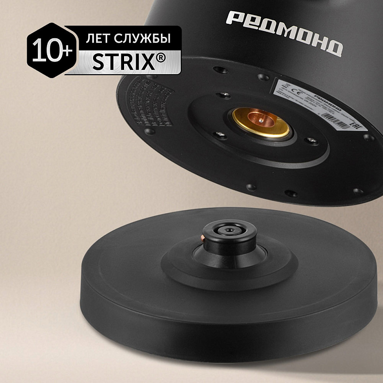 Производитель контроллера — британская компания Strix®. Ее продукты отличаются долговечностью и стабильностью работы. Благодаря качественной контактной группе чайник безопасно использовать.