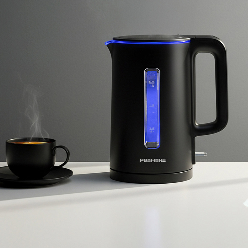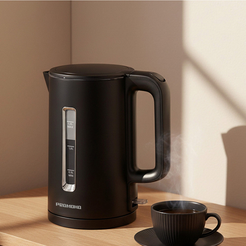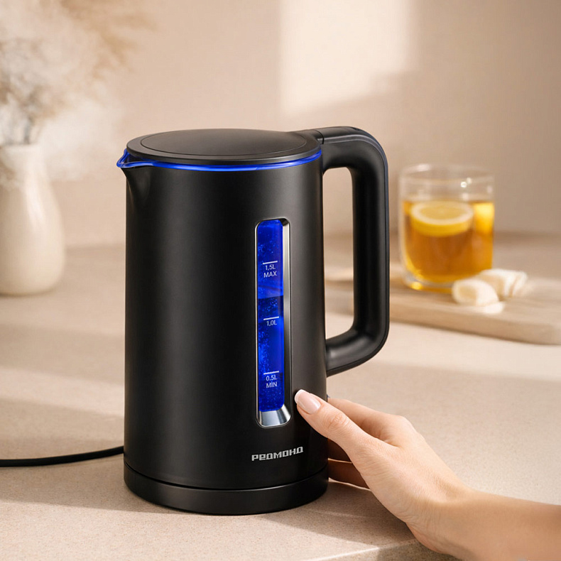 Несмотря на компактный размер чайника, его объем оптимальный — 1,5 литра. Один раз нагрейте воду — и ее хватит на 5–6 чашек чая или кофе. Дополнительное удобство чайнику придает широкая шкала уровня воды с двух сторон.