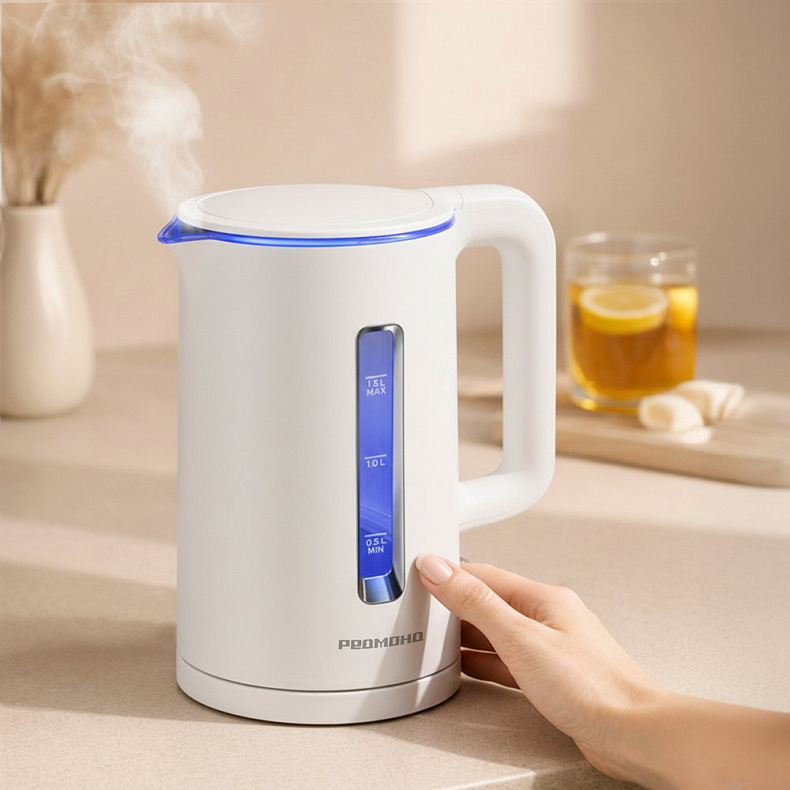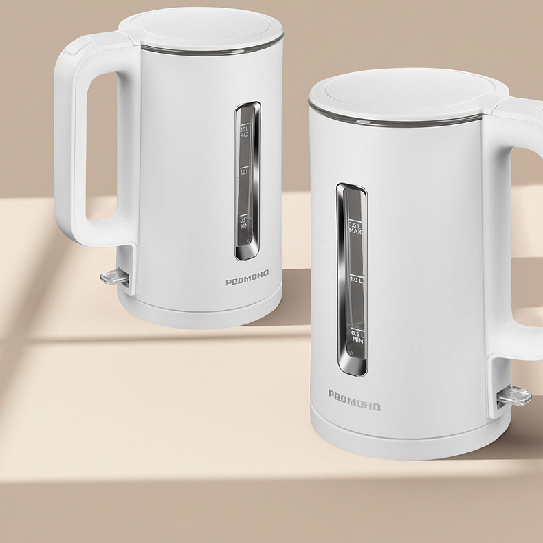 Несмотря на компактный размер чайника, его объем оптимальный — 1,5 литра. Один раз нагрейте воду — и ее хватит на 5–6 чашек чая или кофе. Дополнительное удобство чайнику придает широкая шкала уровня воды с двух сторон.