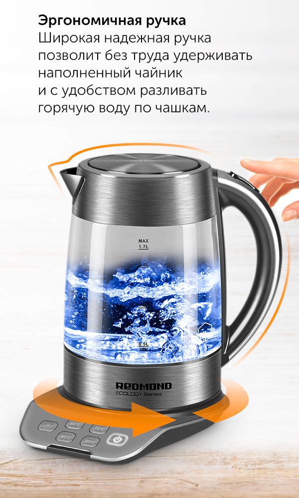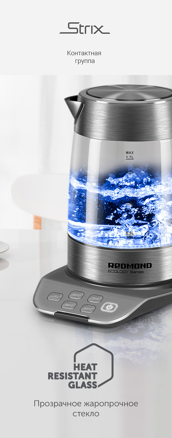 Подставки с расположенной по центру контактной группой Strix® позволяют пользователям легко устанавливать чайник и вращать его на 360°. А значит, чайником с одинаковым комфортом могут пользоваться как правши, так и левши. Кроме того, контактная группа Strix® последней версии позволила реализовать в некоторых чайниках REDMOND возможность выбора температурного режима. Модели чайников с этой опцией могут не только кипятить воду, но и подогревать ее до температур в диапазоне от 40° до 95°C.