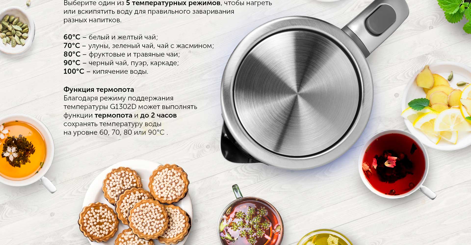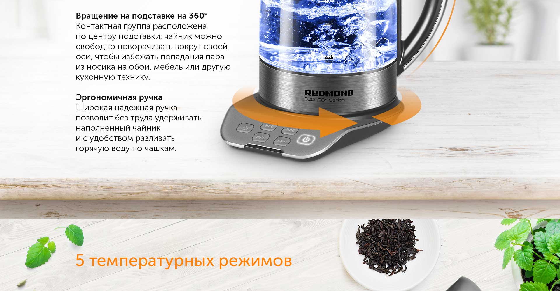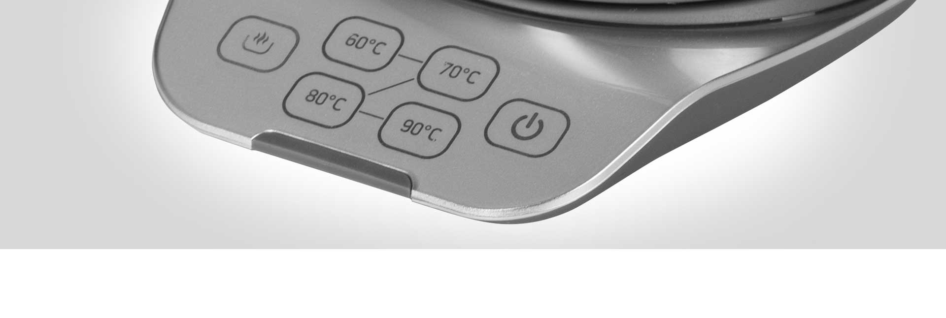 С помощью подставки с сенсорной панелью управления вы сможете в одно касание установить любой из 5 режимов нагрева. Температура 60°С идеально подойдет для заваривания белого чая, 70°С – для зеленого чая, травяной настой, заваренный при 80°С, сохранит максимум полезных свойств, а заваривание черного чая и молотого кофе при 90°С позволит лучше раскрыть вкус и аромат напитка. Чтобы довести воду до кипения, достаточно нажать кнопку включения.