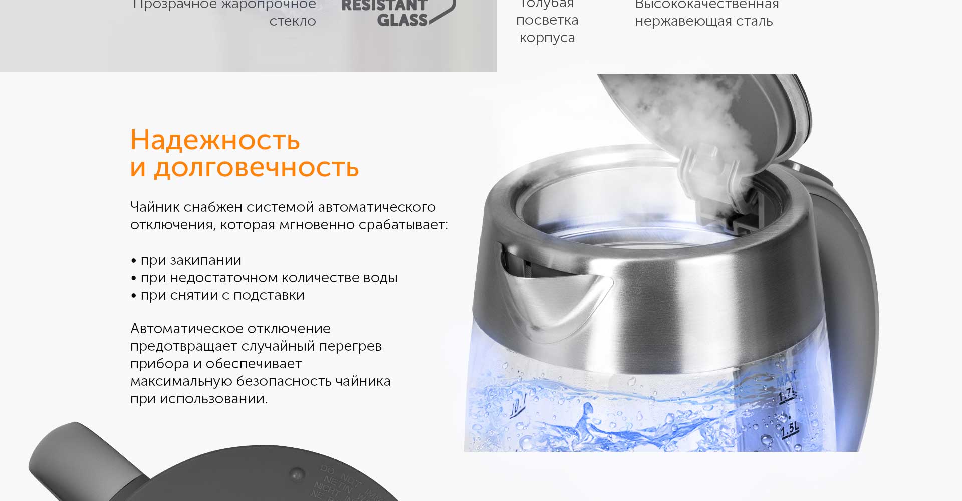 При включении чайника загорается яркая подсветка колбы – она служит и индикатором работы прибора, и украшением кухни.