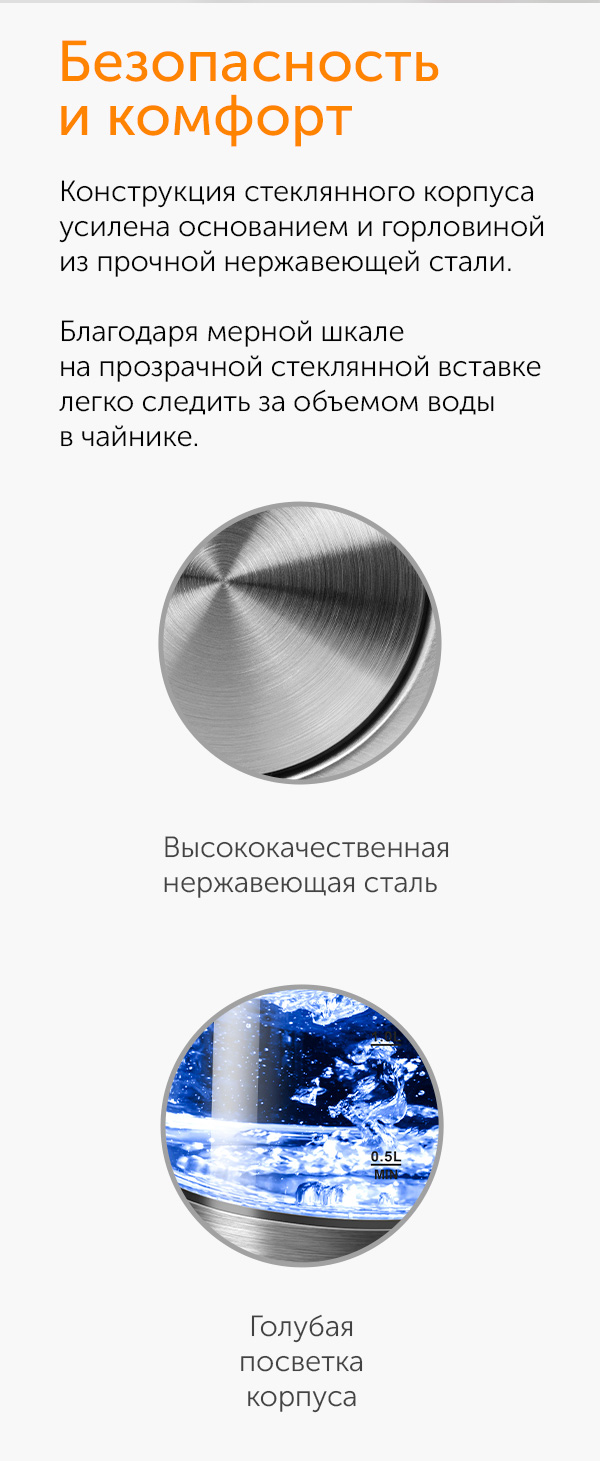 Колба RK-G1302D изготовлена из прочного термостойкого стекла, которое даже при очень сильном нагреве не выделяет токсичных веществ. Прозрачный корпус и градуированная шкала на стенке чайника позволят легко контролировать уровень воды.