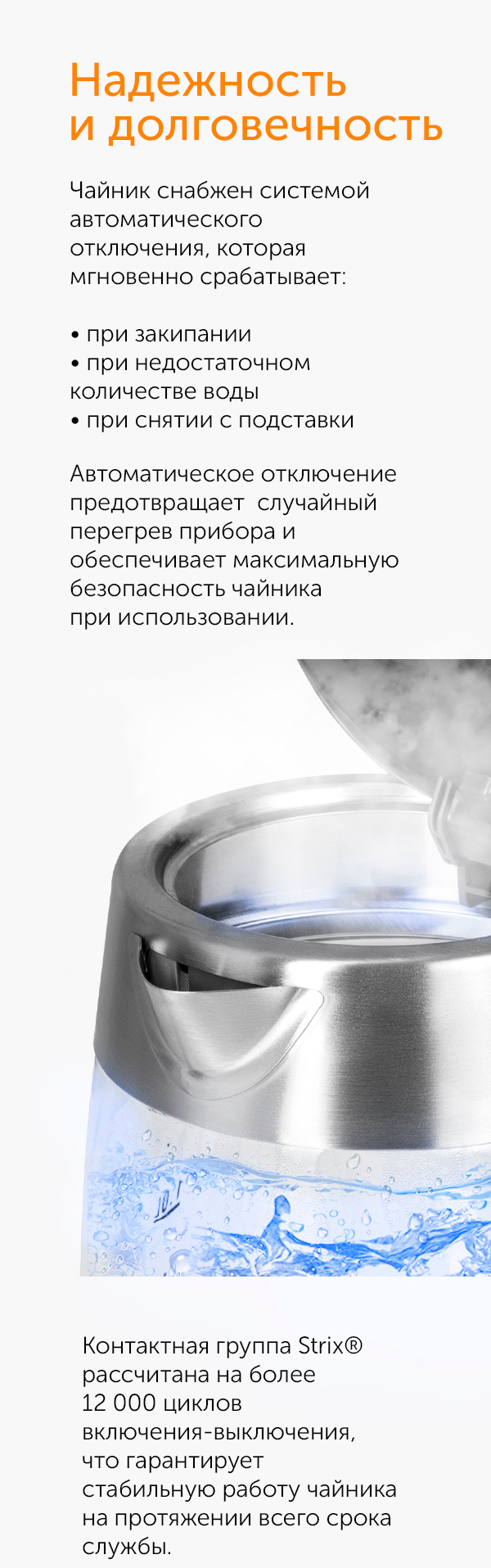 Контактная группа и контроллер Strix® отвечают за качественную и надежную работу прибора на протяжении долгих лет – контактная группа обеспечивает до 12 000 рабочих циклов чайника. Контроллер автоматически отключит RK-G1302D при закипании, снятии с подставки во время работы, а также при недостаточном количестве воды в колбе.