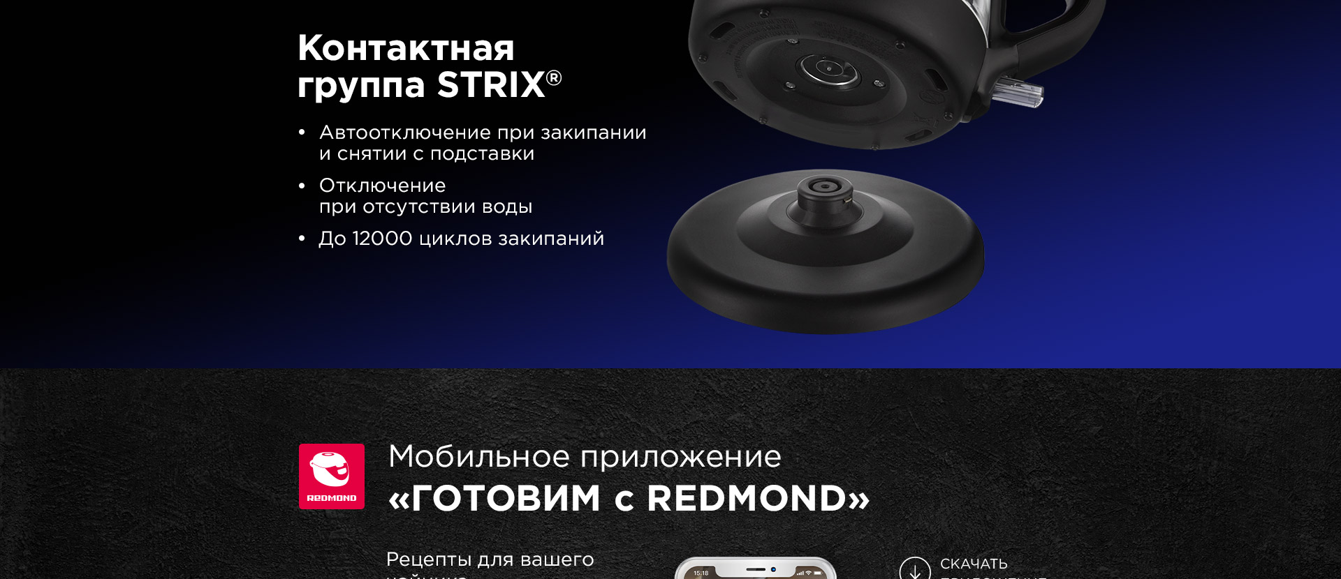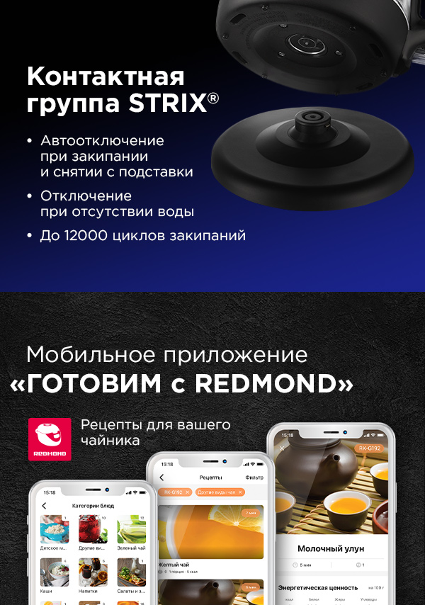 Благодаря контроллерам Strix® чайники REDMOND могут автоматически выключаться при закипании воды, перегреве, а также – если в колбе отсутствует вода или прибор был снят с подставки во время работы. Согласно внутренним тестам компании Strix®, контроллеры обеспечивают минимум до 12000 циклов закипания.