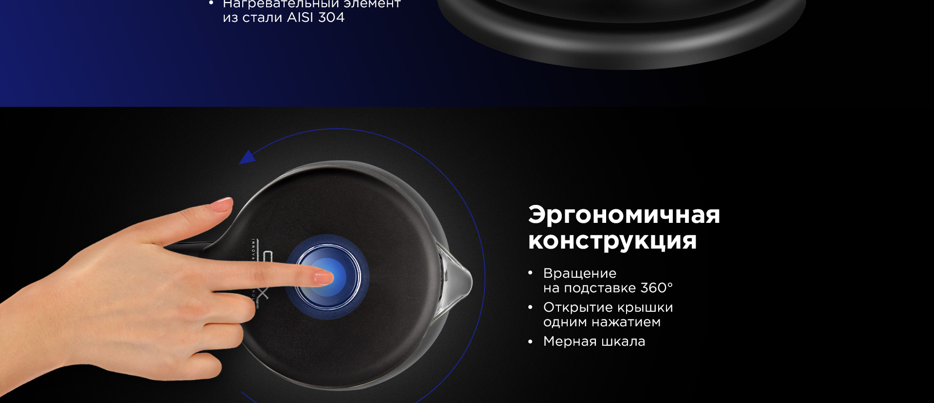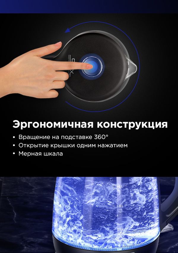 Кольцо светодиодных элементов, опоясывающих стеклянную колбу, красиво подсвечивает воду и эффектно смотрится при ее закипании.