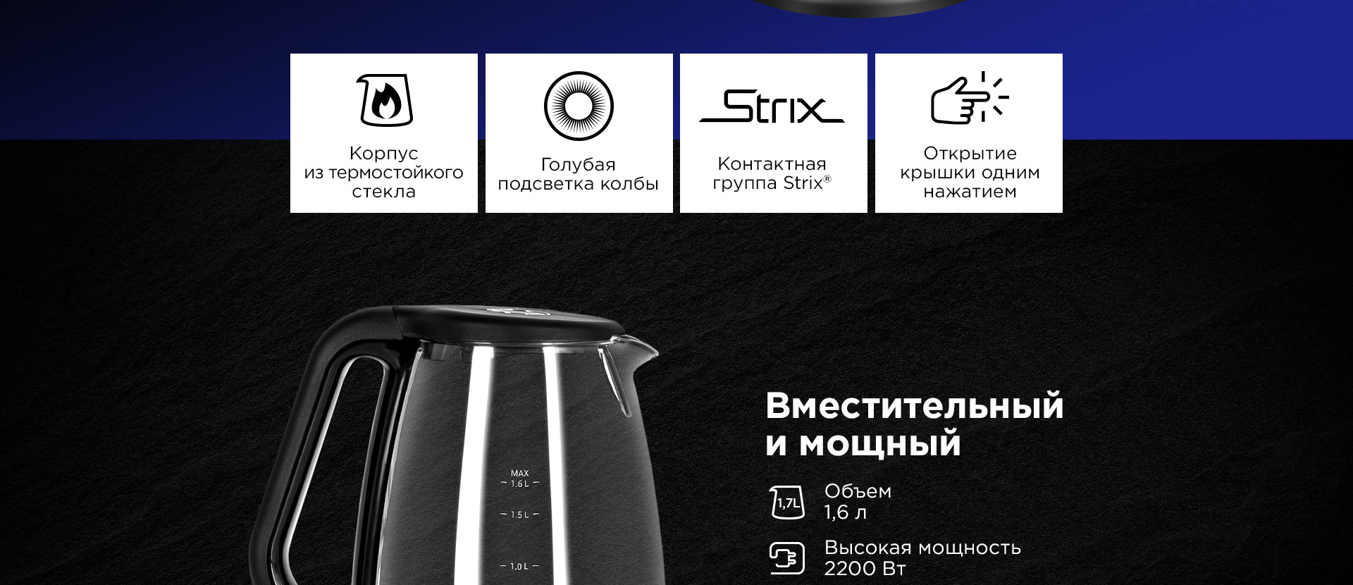 Безопасную работу устройства обеспечивает контактная группа Strix®**. Согласно собственным внутренним тестам компании, контактная группа долговечна и способна обеспечить до 12000 циклов закипания.