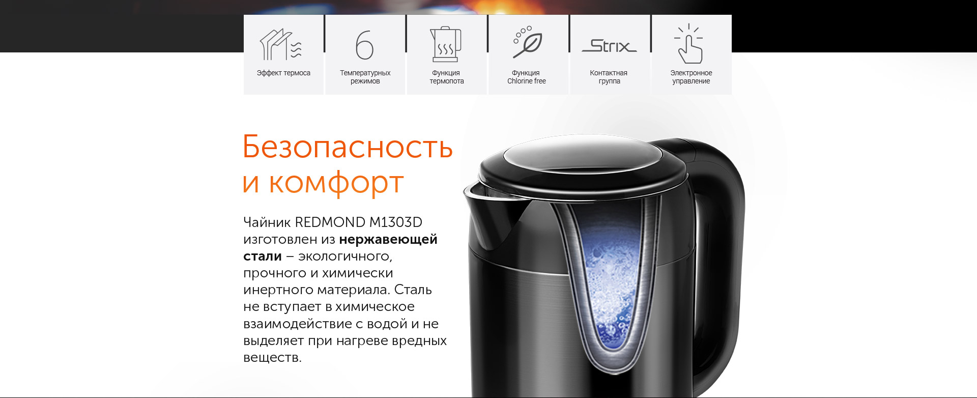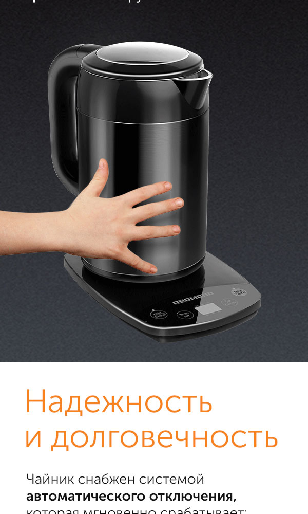 Благодаря контроллерам Strix® чайники REDMOND могут автоматически выключаться при закипании воды, перегреве, а также – если в колбе отсутствует вода или прибор был снят с подставки во время работы. Согласно внутренним тестам компании Strix®, контроллеры обеспечивают минимум до 12000 циклов закипания.