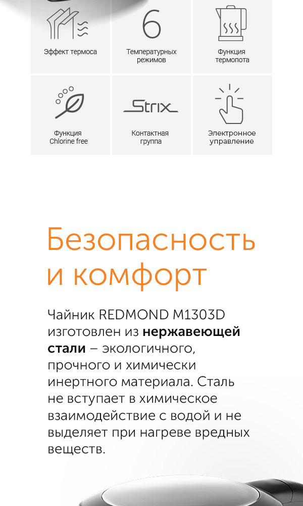 Подставки с расположенной по центру контактной группой Strix® позволяют пользователям легко устанавливать чайник и вращать его на 360°. А значит, чайником с одинаковым комфортом могут пользоваться как правши, так и левши. Кроме того, контактная группа Strix® последней версии позволила реализовать в некоторых чайниках REDMOND возможность выбора температурного режима. Модели чайников с этой опцией могут не только кипятить воду, но и подогревать ее до температур в диапазоне от 40° до 95°C.