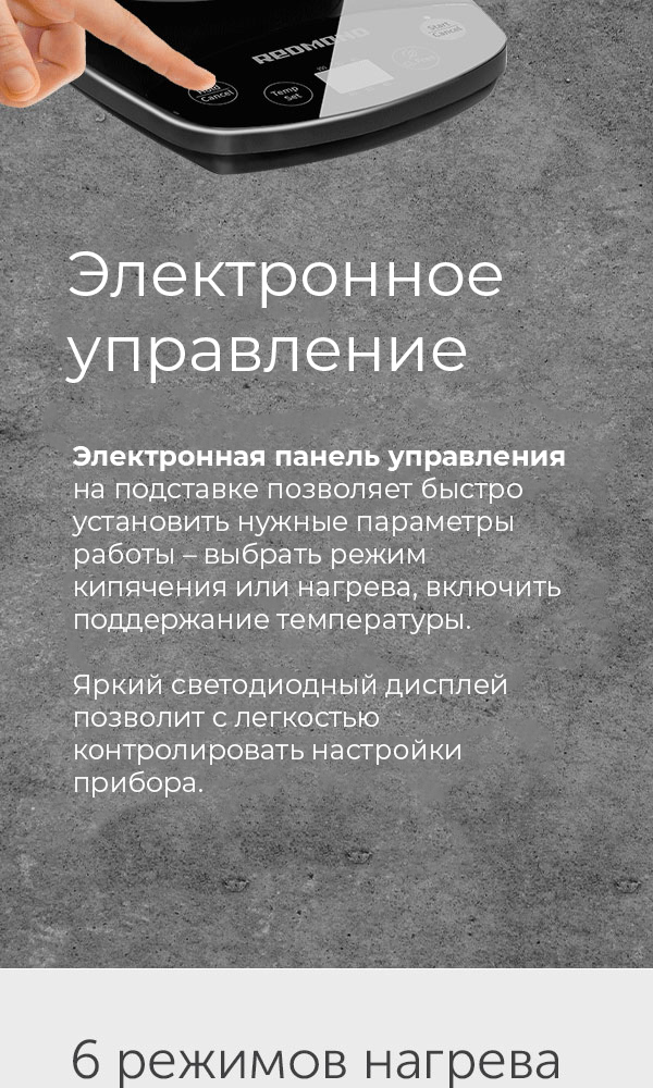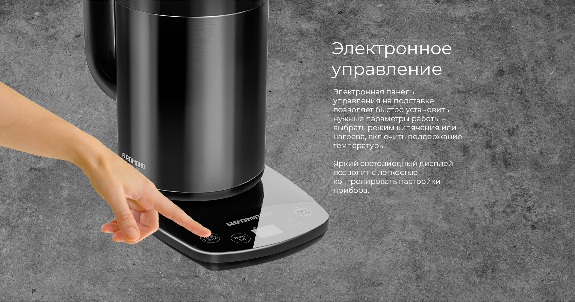 Используя электронную панель управления, вы можете установить один из режимов нагрева – 40, 55, 80, 85, 90, 100°C. Чайник быстро вскипятит или подогреет воду до оптимальной температуры для заваривания зеленого чая или разведения детской смеси.