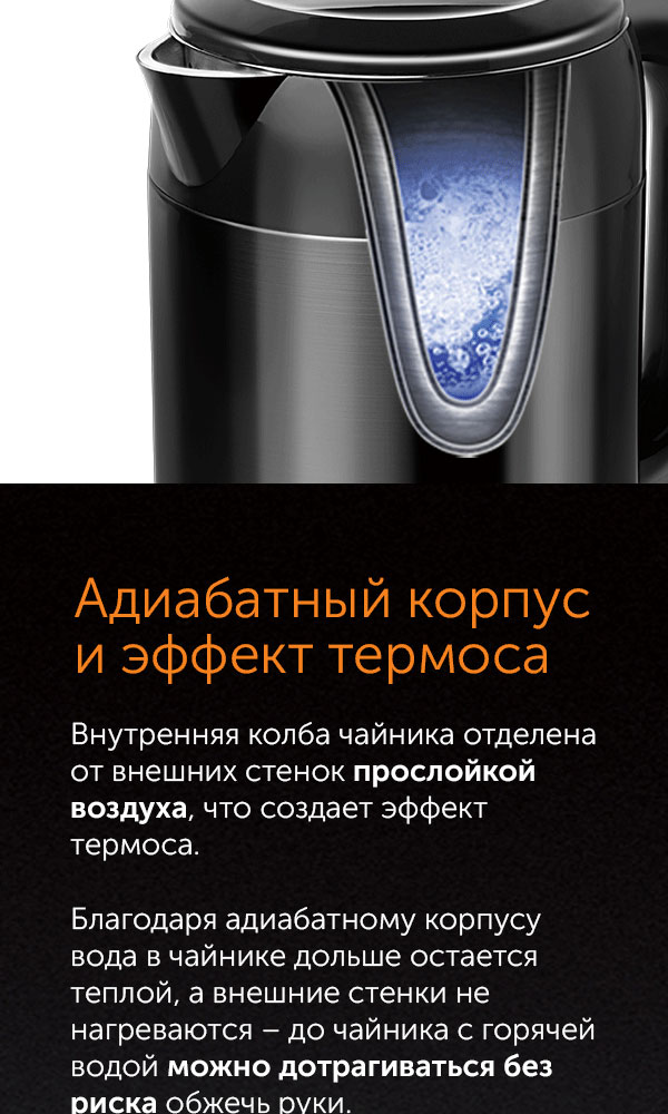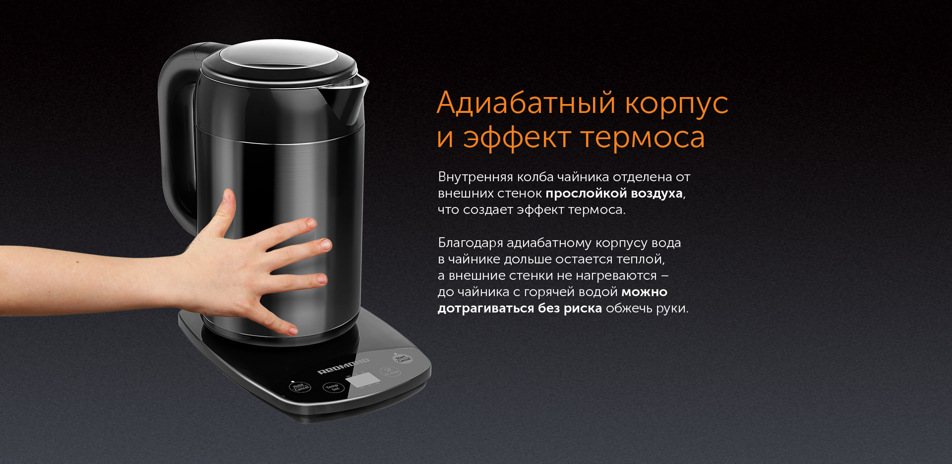 Благодаря теплоизоляционной адиабатной оболочке внешние стенки RK-M1303D не нагреваются, что исключает возможность обжечься при случайном прикосновении к чайнику.