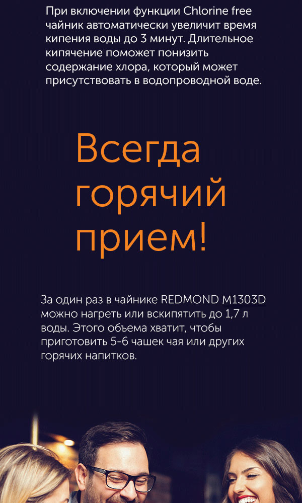 Электрический чайник REDMOND RK-M1303D не только быстро вскипятит воду, но и позволит нагреть ее до нужной температуры, а также – освободить от хлора.