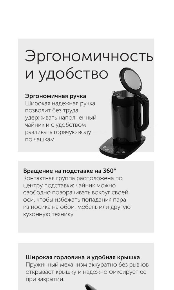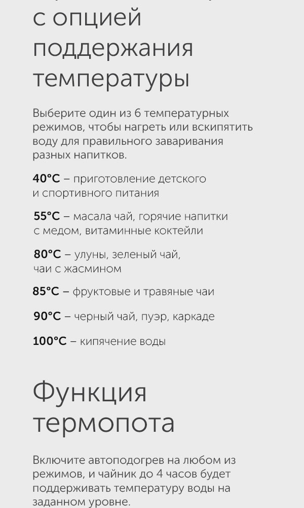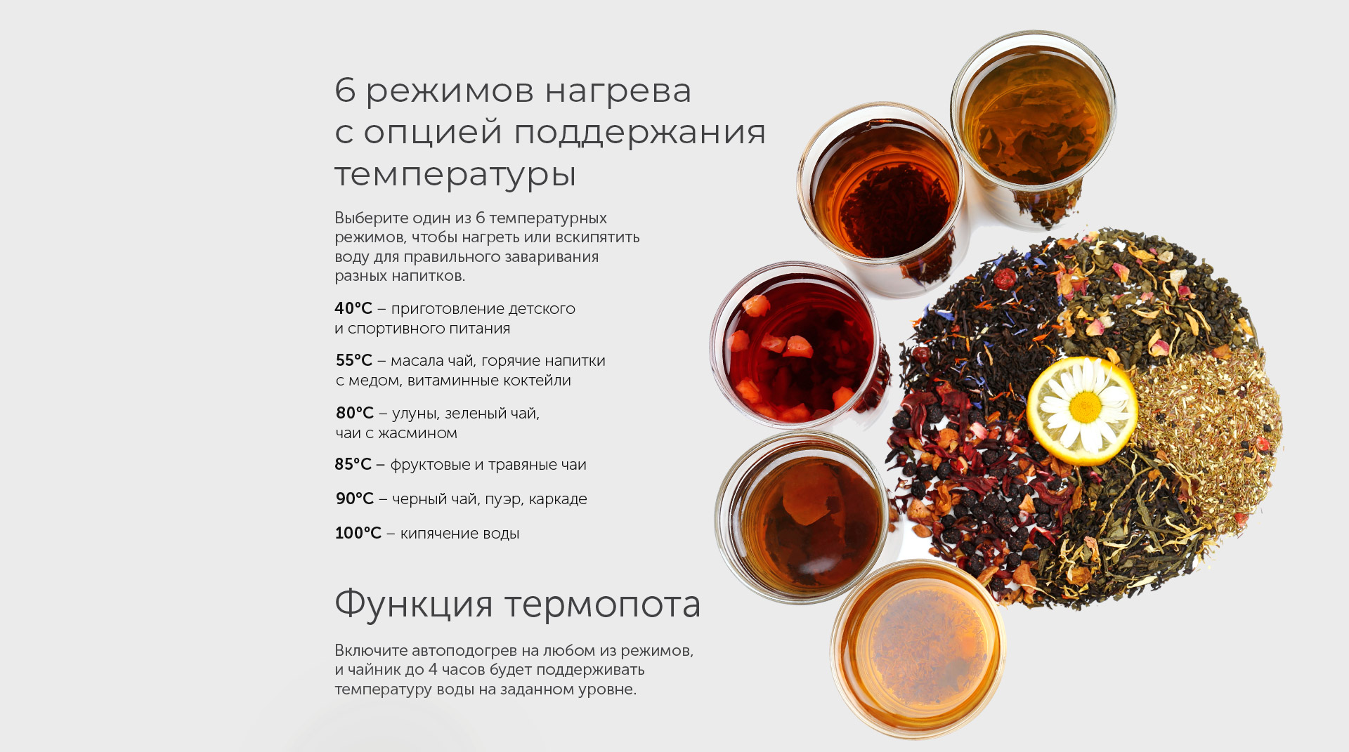 Во всех температурных режимах доступна функция автоподогрева. После того, как чайник нагреет воду до заданного уровня, он будет поддерживать установленную температуру в течение 4 часов. Используйте эту функцию, когда собираетесь всей семьей за чаепитием, и вам не нужно будет постоянно подогревать воду, чтобы налить следующую порцию чая.