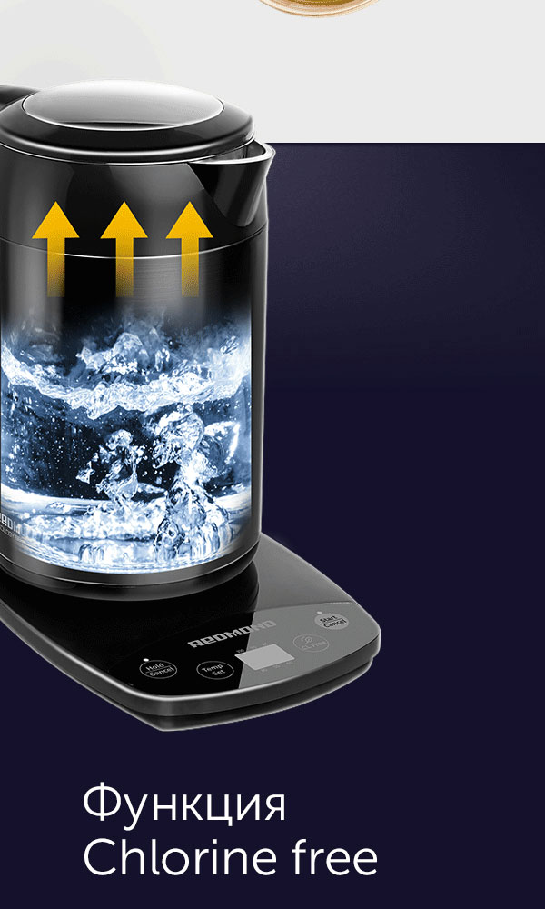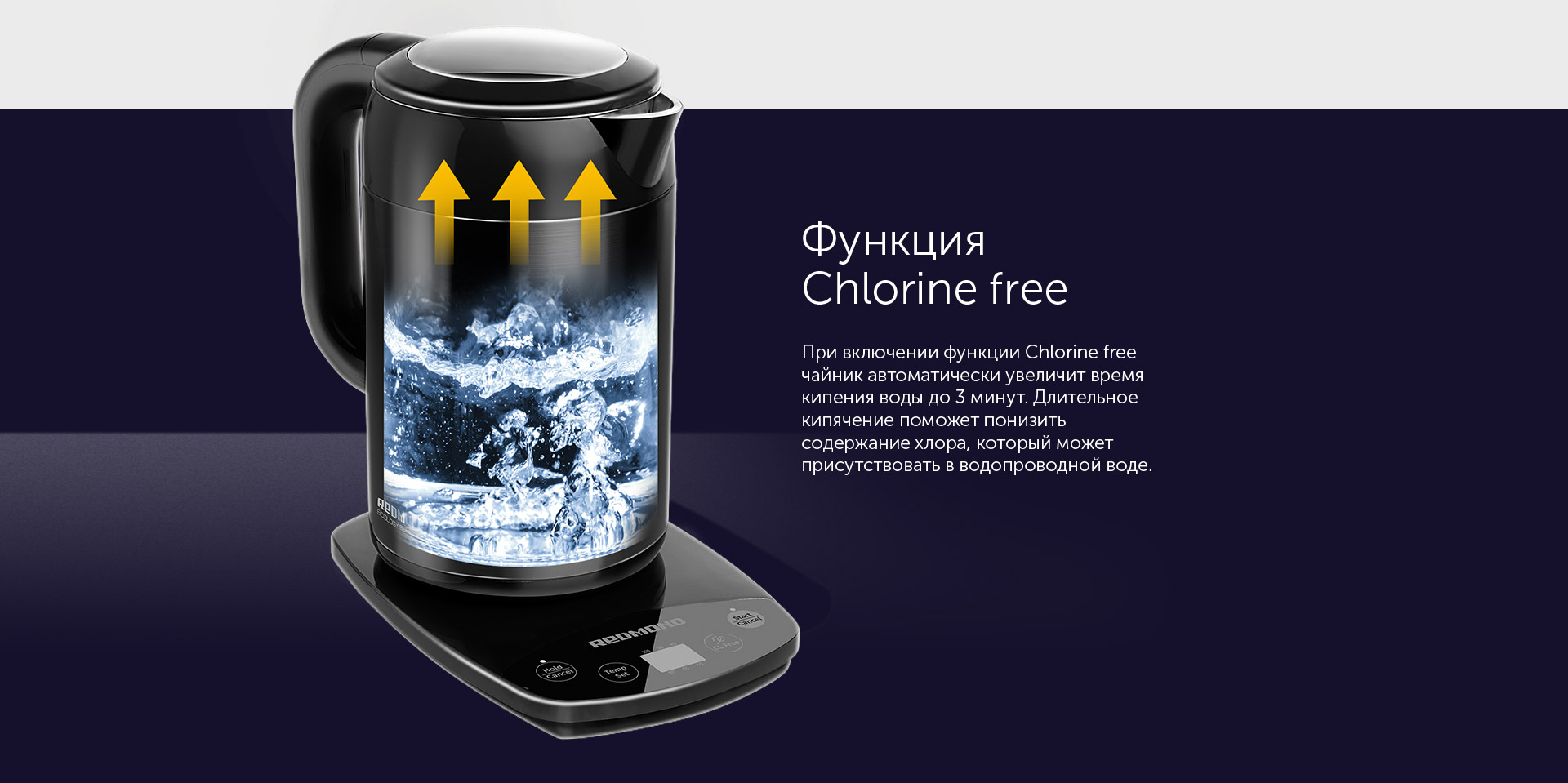 RK-M1303D оснащен функцией Chlorine free (Хлорин Фри), предназначенной для испарения хлора. При включении этой функции чайник будет кипятить воду на протяжении 3 минут – это поможет значительно снизить содержание хлора в водопроводной воде.
